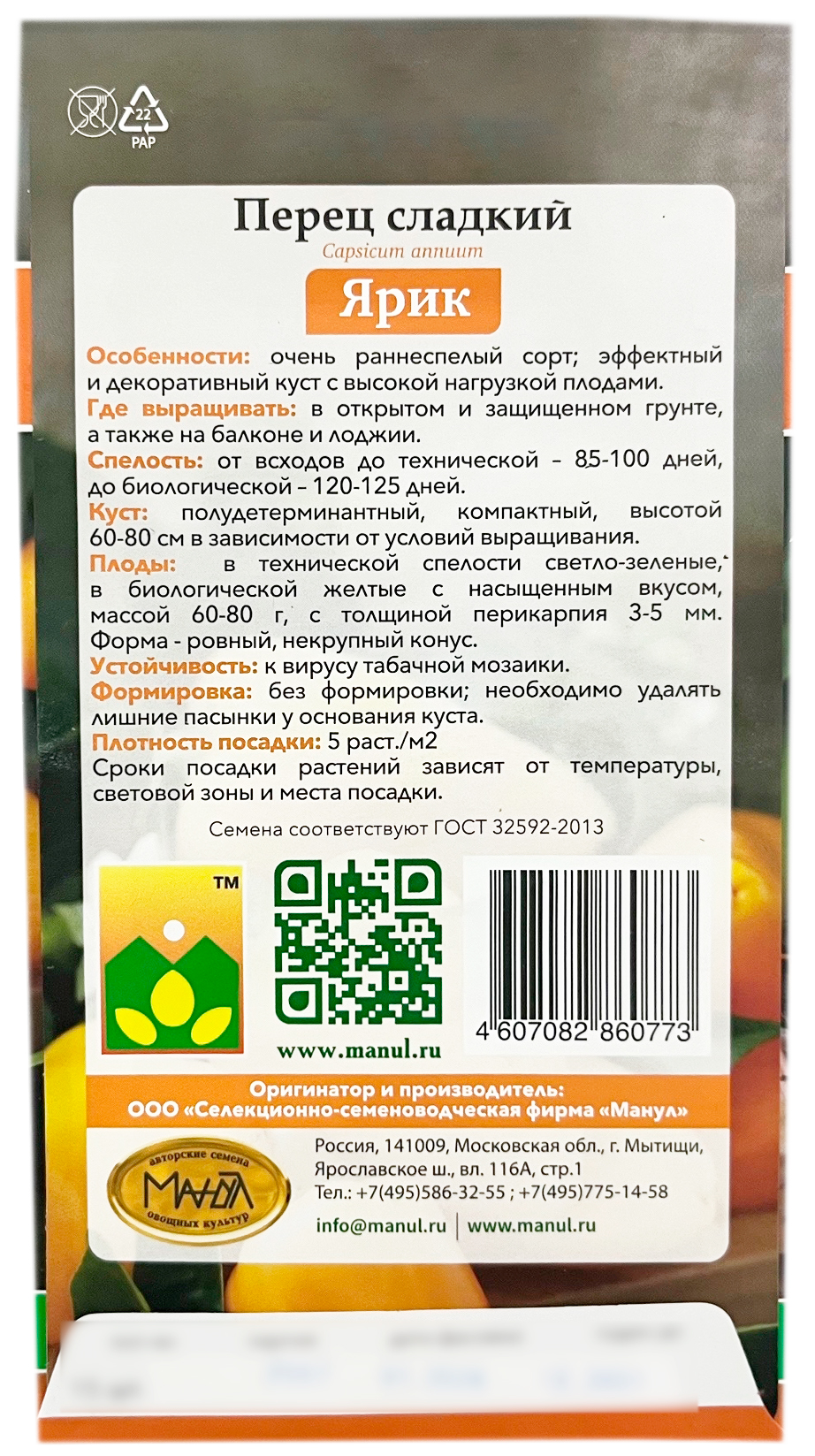 Перец СЛАДКИЙ ЯРИК МАНУЛОчень раннеспелый сорт; эффектный и декоративный куст с высокой нагрузкой плодами. От всходов до технической 85-100 дней, до биологической 120-125 дней. Полудетерминантный, компактный, высотой 60-80 см в зависимости от условий выращивания. В технической спелости светло-зеленые, в биологической желтые с насыщенным вкусом. Вес Ярика от 60 до 80 г. Форма – ровный, некрупный конус. Толщина перикарпия 3-5 мм.
