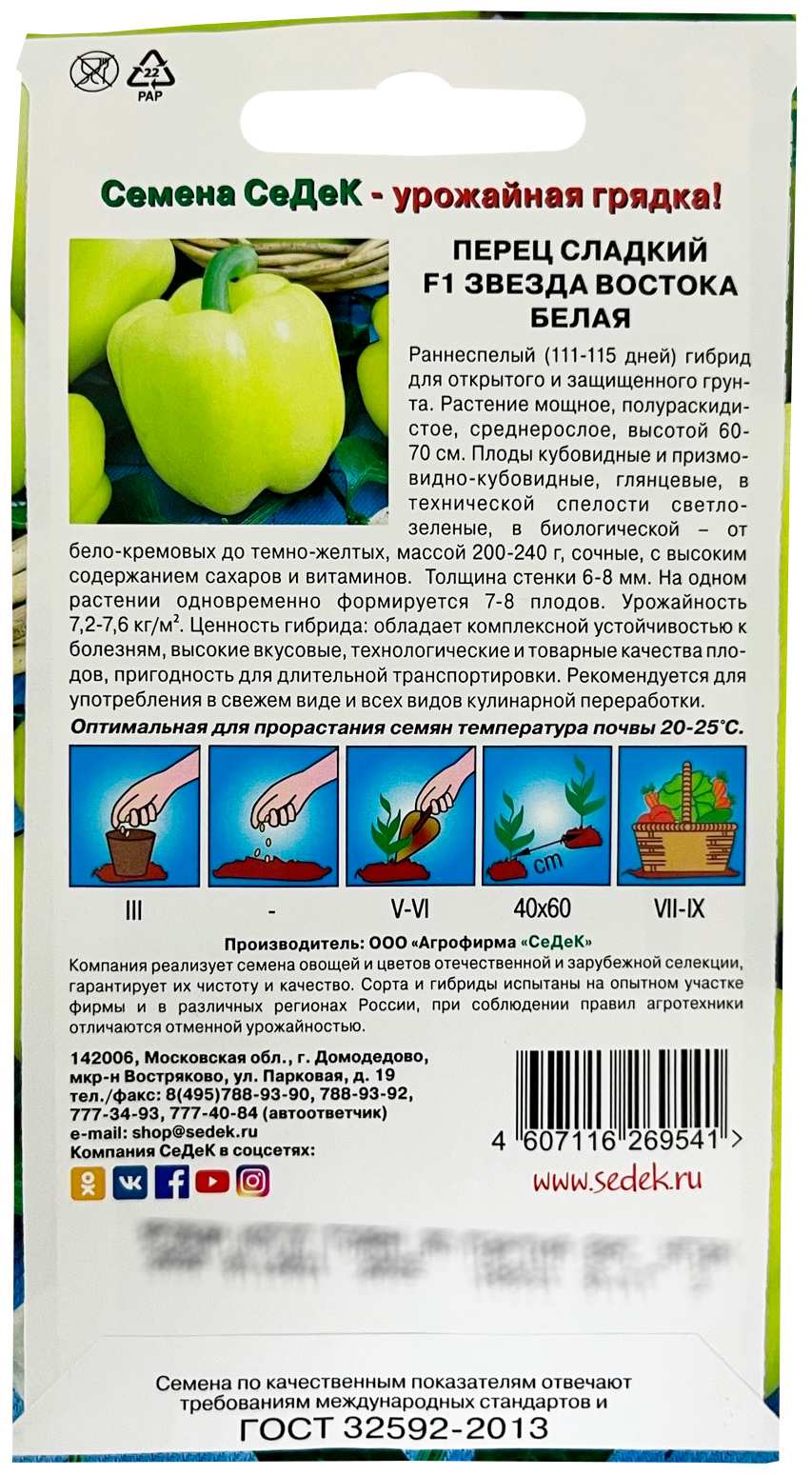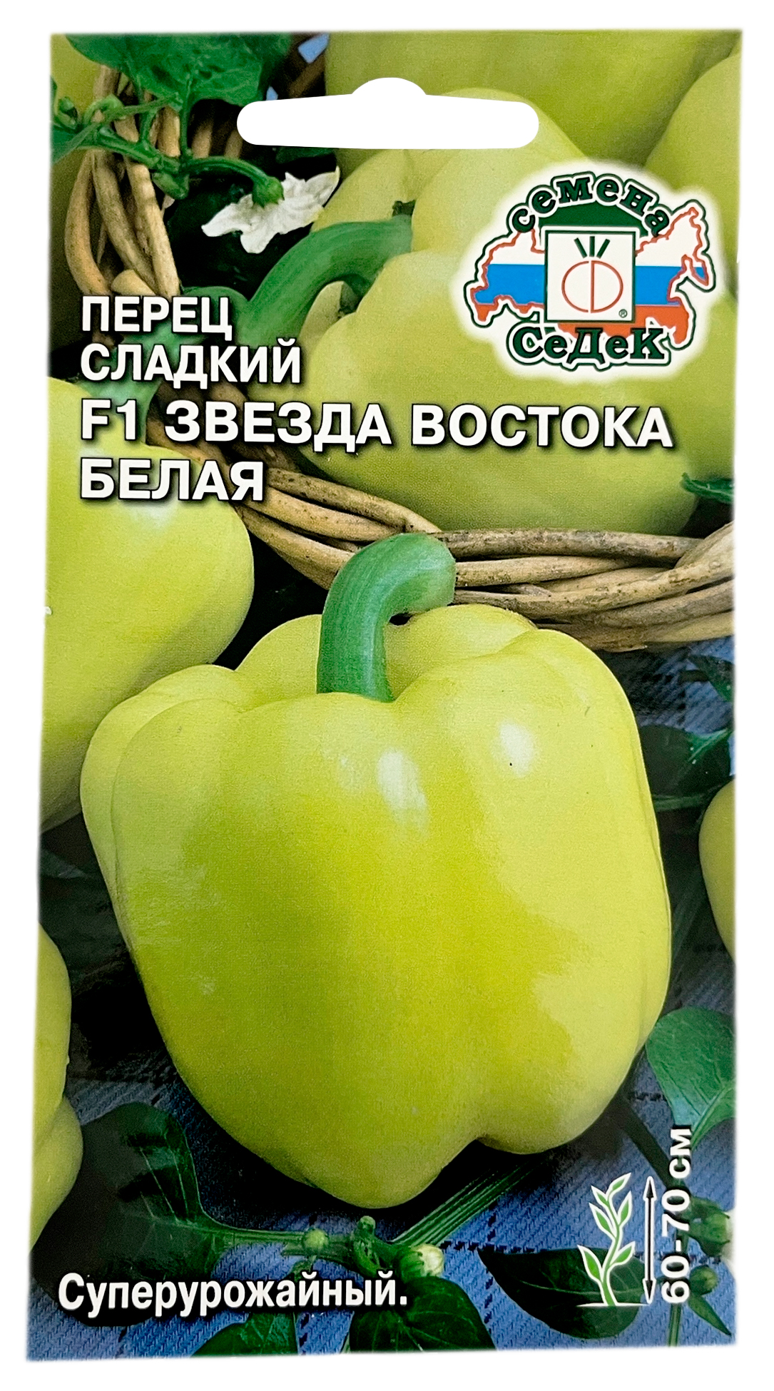 Перец Звезда Востока Белая F1 СеДеКРаннеспелый (111-115 дней) гибрид для открытого и защищенного грунта. Растение мощное, полураскидистое, среднерослое, высотой 60-70 см. Плоды кубовидные и призмовидно-кубовидные, глянцевые, в технической спелости светло-зеленые, в биологической – от бело-кремовых до темно-желтых, массой 200-240 г, сочные, с высоким содержанием сахаров и витаминов. Толщина стенки 6-8 мм. На одном растении одновременно формируется 7-8 плодов. Урожайность 7,2-7,6 кг/м²,. Ценность гибрида: обладает комплексной устойчивостью к болезням, высокие вкусовые, технологические и товарные качества плодов, пригодность для длительной транспортировки. Рекомендуется для употребления в свежем виде и всех видов кулинарной переработки.