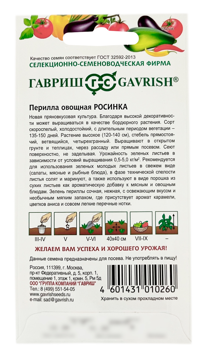 Перилла овощная РОСИНКА ГАВРИШНовая пряно-вкусовая культура. Благодаря высокой декоративности может выращиваться в качестве бордюрного растения. Сорт скороспелый, холодостойкий, с длительным периодом вегетации – 135-150 дней. Растение высокое – 120-140 см, стебель прямостоячий, ветвящийся, четырехгранный. Выращивается в открытом грунте и в теплицах, через рассаду или прямым посевом. Масса одного растения 200-500 г. Урожайность листьев в зависимости от условий выращивания 0,5-5,0 кг/м2. Рекомендуется для использования зеленых молодых листьев в свежем виде (салатах, мясных и рыбных блюдах), в фазе технической спелости листья солят и маринуют, а также используют в виде порошка из сухих листьев как ароматической добавки к мясным и овощным блюдам. Зелень периллы сочная, нежная с освежающим вкусом и необычным мягким ароматом, где присутствуют тона карамели, цветков аниса и совсем легкие перечные тона.