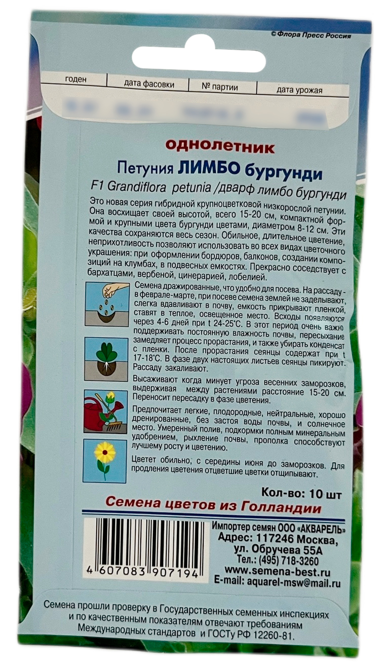 Петуния ЛИМБО бургунди АКВАРЕЛЬЭто новая серия гибридной крупноцветковой низкорослой петунии. Она восхищает своей высотой, всего 15-20 см, компактной формой и крупными цвета бургунди цветами, диаметром 8-12 см. Эти качества сохраняются весь сезон. Обильное, длительное цветение, неприхотливость позволяют использовать во всех видах цветочного украшения: при оформлении бордюров, балконов, создании композиций на клумбах, в подвесных емкостях. Прекрасно соседствует с бархатцами, вербеной, цинерарией, лобелией.
