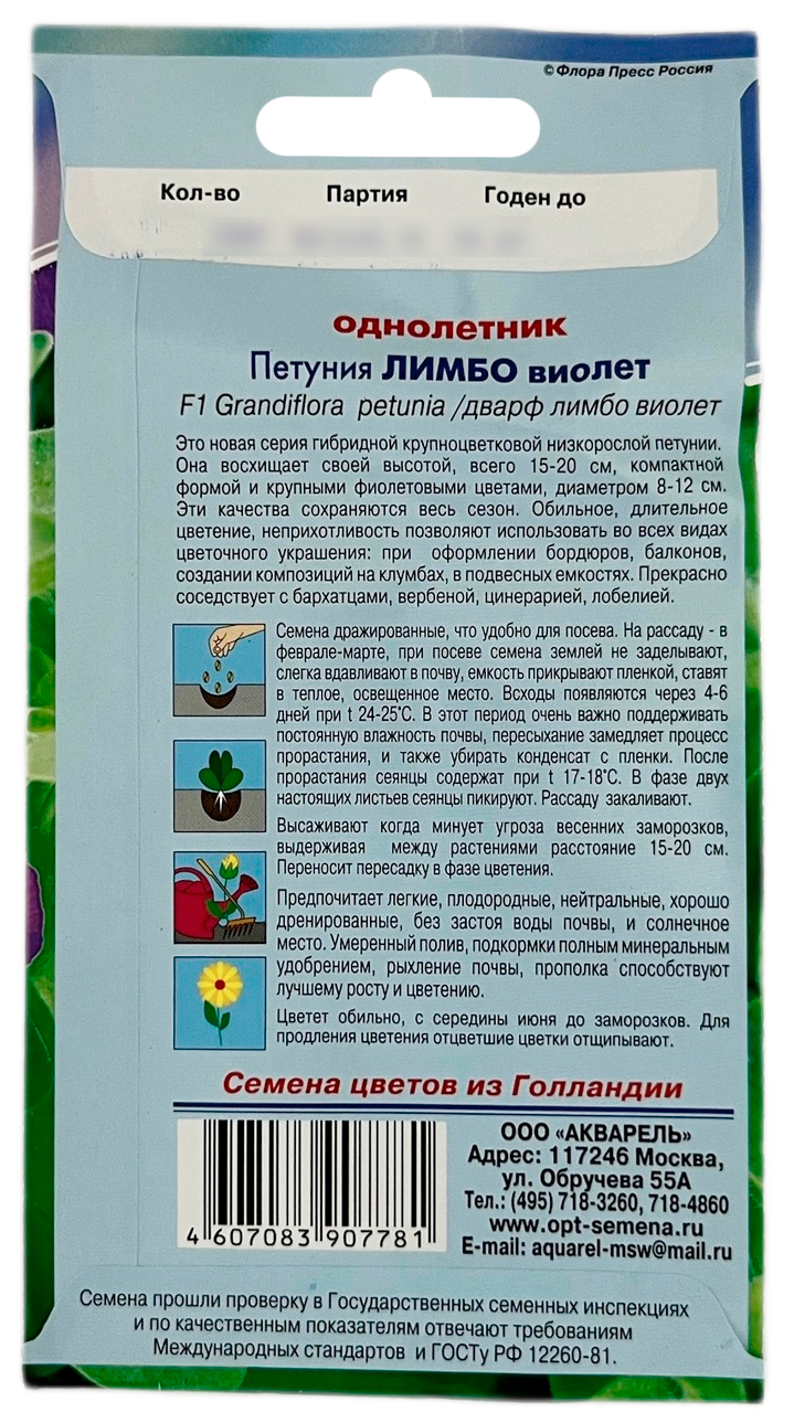 Петуния ЛИМБО виолет АКВАРЕЛЬЭто новая серия гибридной крупноцветковой низкорослой петунии. Она восхищает своей высотой, всего 15-20 см, компактной формой и крупными фиолетовыми цветами, диаметром 8-12 см. Эти качества сохраняются весь сезон. Обильное, длительное цветение, неприхотливость позволяют использовать во всех видах цветочного украшения: при оформлении бордюров, балконов, создании композиций на клумбах, в подвесных емкостях. Прекрасно соседствует с бархатцами, вербеной, цинерарией, лобелией.