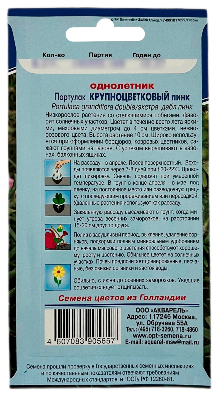 Портулак КРУПНОЦВЕТКОВЫЙ ПИНК АКВАРЕЛЬНизкорослое растение со стелющимися побегами, фаворит солнечных участков. Цветет в течение всего лета яркими, махровыми диаметром до 4 см цветками, нежно-розового цвета. Высота растение 10 см. Широко используется при оформлении бордюров, ковровых цветников, сажают группами на газоне. С успехом выращивают в вазонах, балконных ящиках.