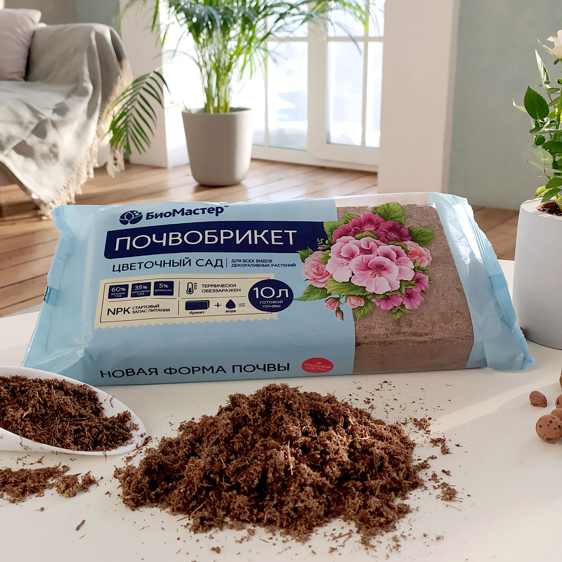 Почвобрикет БиоМастер «Цветочный сад» — состав для выращивания декоративных садовых и комнатных растений. В составе почвосмеси — торф, вермикулит и необходимые для роста и развития растений питательные элементы: фосфор, азот, калий, цинк, железо. Брикет разводится в 4 л теплой воды, увеличиваясь в объеме до 10 л готового грунта. Страна производства товара — Россия.Преимущества: