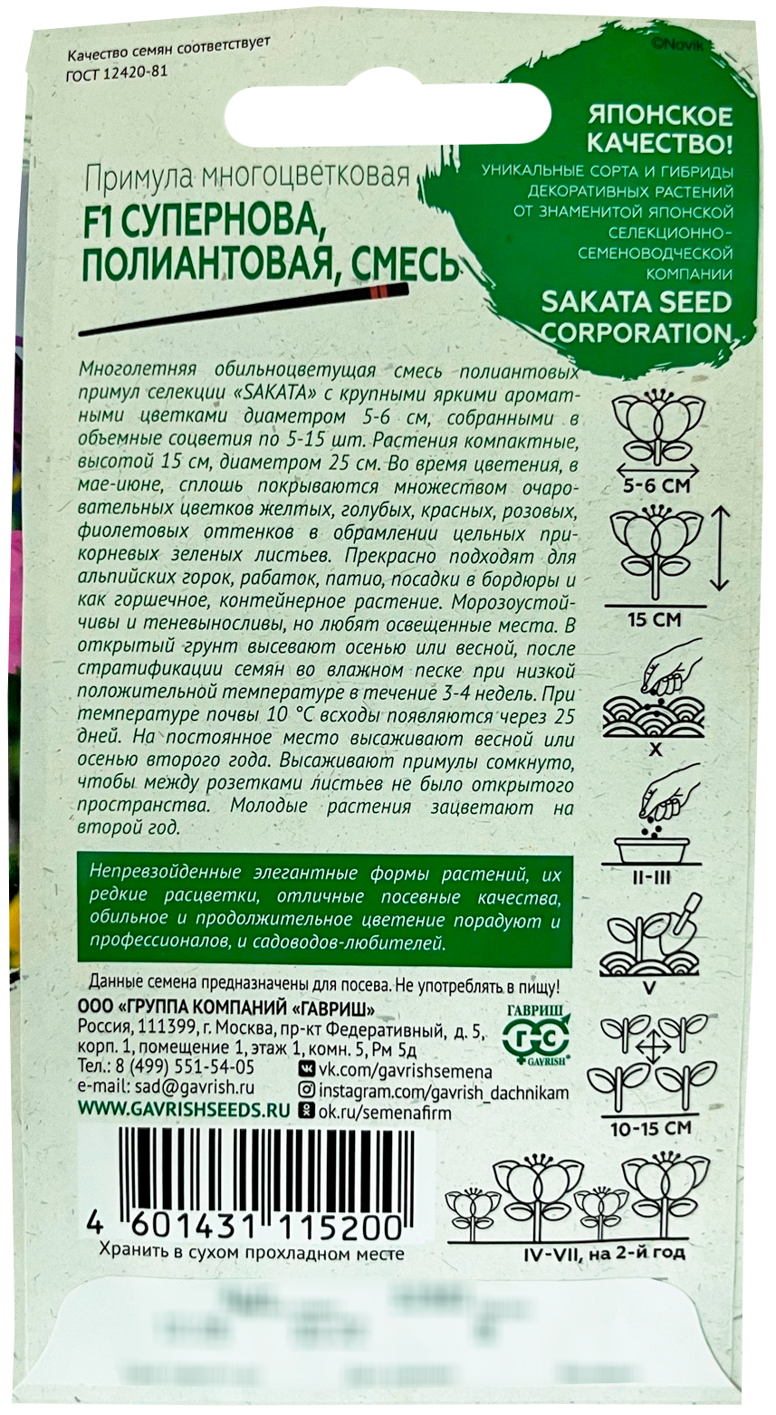 Примула Супернова F1, полиантовая Саката серия Эксклюзив Н22 (Primula x polyantha Mill.)Многолетняя обильноцветущая смесь полиантовых примул селекции «SAKATA» с крупными, яркими, ароматными цветками диаметром 5-6 см, собранными в объемные соцветия по 5-15 шт. Растения компактные высотой 15 см, диаметром 25 см. Во время цветения, в мае- июне, сплошь покрываются множеством очаровательных цветков желтых, голубых, красных, розовых, фиолетовых оттенков, в обрамлении цельных прикорневых зеленых листьев. Прекрасно подходят для каменных горок, рабаток, патио, для посадки в бордюры и как горшечное, контейнерное растение. Морозоустойчивы и теневыносливы, но любят освещенные места. В открытый грунт высевают осенью или весной после стратификации семян во влажном песке при низкой положительной температуре, в течение 3-4 недель. При температуре почвы 10°С всходы появляются через 25 дней. На постоянное место высаживают весной или осенью второго года. Высаживают примулы сомкнуто, чтобы между розетками листьев не было открытого пространства. Молодые растения зацветают на второй год.