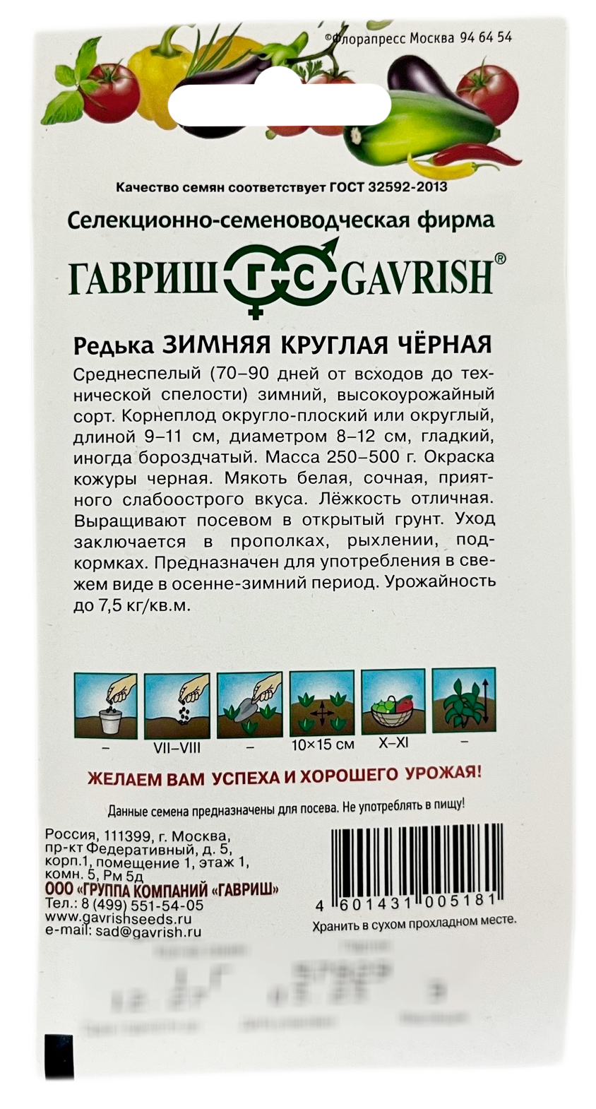 Редька зимняя круглая чёрная ГАВРИШВысокоурожайный, среднеспелый зимний сорт. От всходов до технической спелости 70-90 дней. Корнеплод округло-плоский или округлый, длиной 9-11 см, диаметром 8-12 см, гладкий, иногда бороздчатый. Масса 250-500 г. Окраска кожуры черная. Мякоть белая , сочная, приятного слабо-острого вкуса. Урожайность до 7,5 кг/м2. Лежкость отличная. Предназначен для потребления в свежем виде в осенне-зимний период.