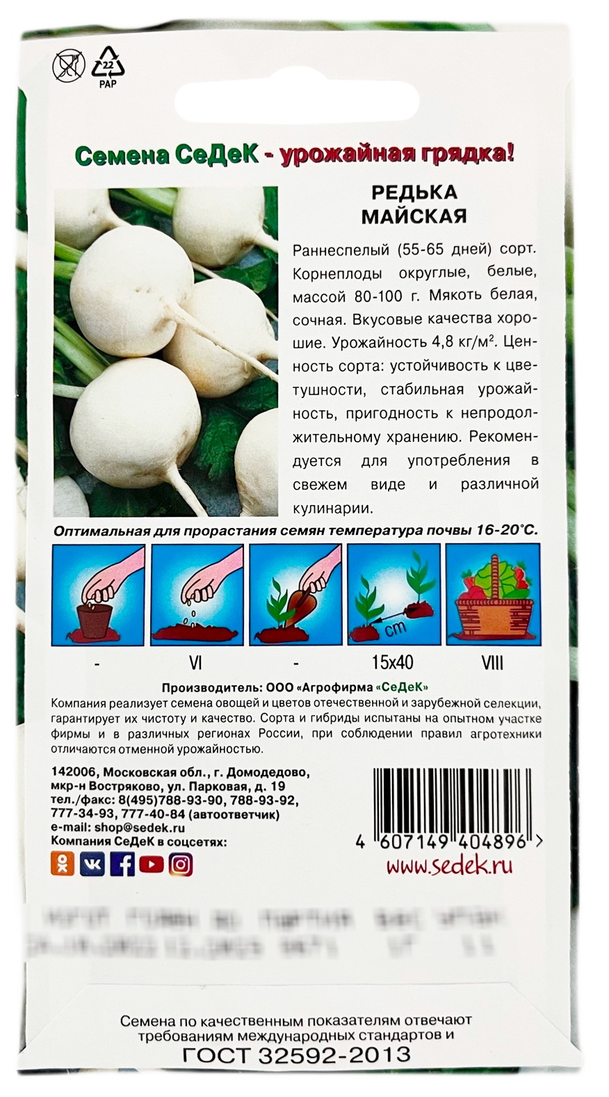 Редька Майская СеДеКРаннеспелый (55-65 дней) сорт. Корнеплоды округлые, белые, массой 80-100 г. Мякоть белая, сочная. Вкусовые качества хорошие. Урожайность 4,8 кг/м. Ценность сорта: устойчивость к цветушности, стабильная урожайность, пригодность к непродолжительному хранению. Рекомендуется для употребления в свежем виде и различной кулинарии.