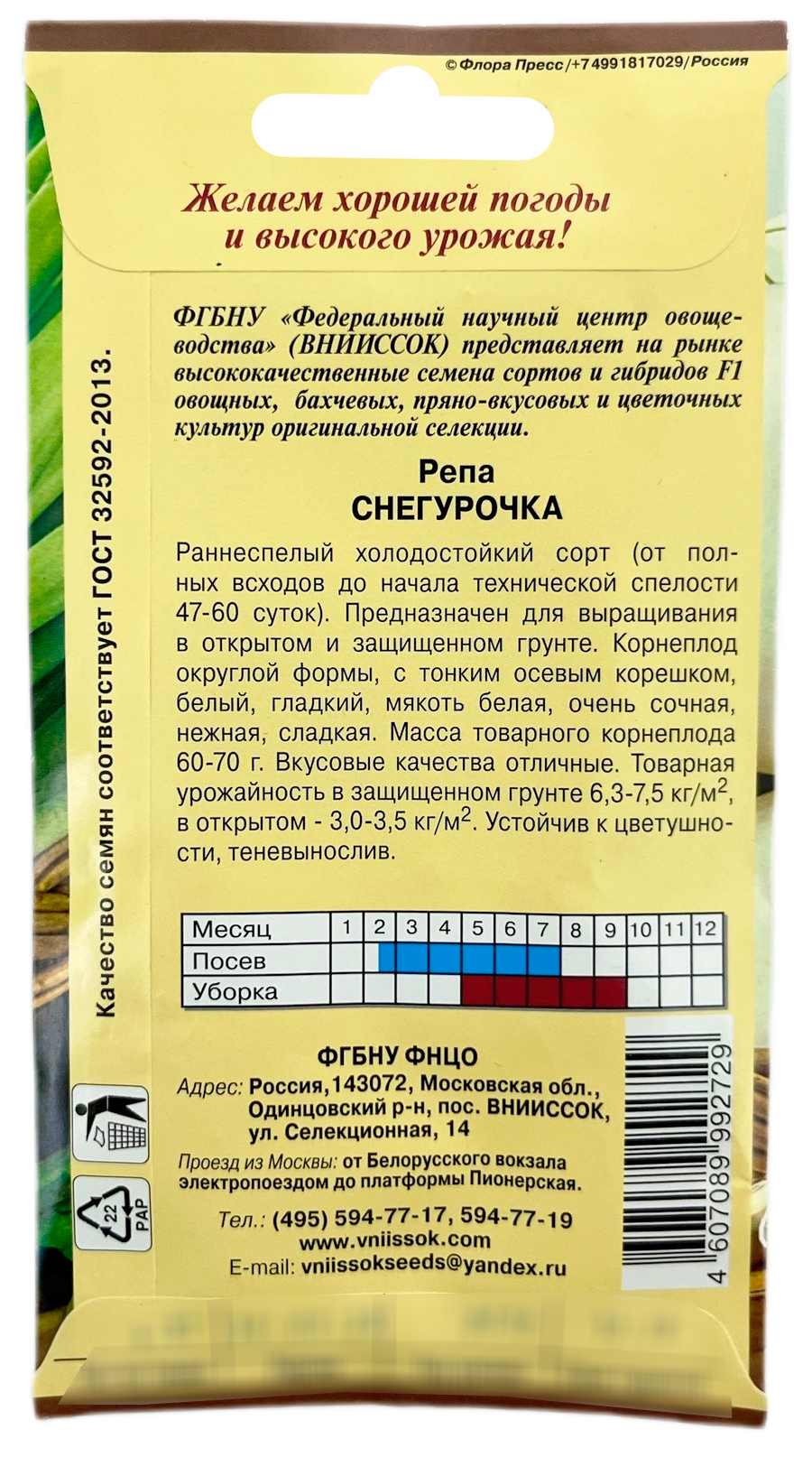 Репа Снегурочка ВНИИССОКРаннеспелый холодостойкий сорт (47-60 суток). Корнеплод округлой формы с тонким осевым корешком, белый, гладкий, мякоть белая, очень сочная, нежная, сладкая. Масса товарного корнеплода 60-70 г. Вкус отличный. Листья используются как салатная зелень. Товарная урожайность в защищенном грунте 6,3-7,5 кг/м2, в открытом 15-20 т/га, товарность 95%. Устойчив к цветушности, теневынослив. Рекомендуется для возделывания в открытом и защищенном грунте.