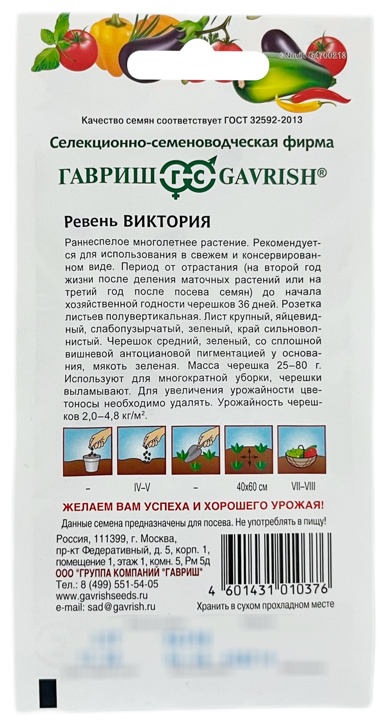 Ревень ВИКТОРИЯ ГАВРИШРаннеспелое многолетнее растение. Рекомендуется для использования в свежем и консервированном виде. Период от отрастания (на второй год жизни после деления маточных растений или на третий год после посева семян) до начала хозяйственной годности черешков 36 дней. Розетка листьев полувертикальная. Лист крупный, яйцевидный, слабопузырчатый, зеленый, край сильноволнистый. Черешок средний, зеленый со сплошной вишневой антоциановой пигментацией у основания, мякоть зеленая. Масса черешка 25-80 г. Используется для многократной уборки, черешки выламывают. Для увеличения урожайности цветоносы необходимо удалять. Урожайность черешков 2,0-4,8 кг/м2.