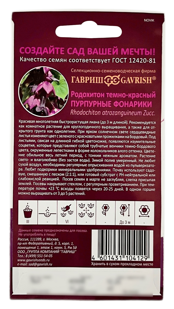 Родохитон темно красный ПУРПУРНЫЕ ФОНАРИКИ ГАВРИШКрасивая многолетняя, быстрорастущая лиана (до 3 м длиной). Рекомендуется как комнатное растение для круглогодичного выращивания, а также для открытого грунта как однолетник. При ярком солнечном свете сердцевидные листья изменят цвет с зеленого с красноватыми прожилками на бордовый. Под листьями, свисая на длинной гибкой цветоножке, появляются изумительные соцветия, которые представляют собой трубчатые венчики темно-бордового цвета, окруженные лепестками в форме колокольчиков алого оттенка. Цветение обильное, весь летний период, с тонким, нежным ароматом. Растение свето- и влаголюбиво (без застоя воды). Зимой полив умеренный. Не любит сухой воздух, необходимы регулярные опрыскивания водой из пульверизатора. Любит подкормки минеральными удобрениями. Почву используют садовую, смешанную с песком (2:1:1) или готовый субстрат с РН нейтральной или слабокислой реакцией. Посев семян в марте, не заглубляя, слегка присыпая землей. Посевы накрывают стеклом, с регулярным проветриванием. При температуре почвы +23градС всходы появятся через 20-25 дней. В одном горшке можно выращивать от 3-5 растений.
