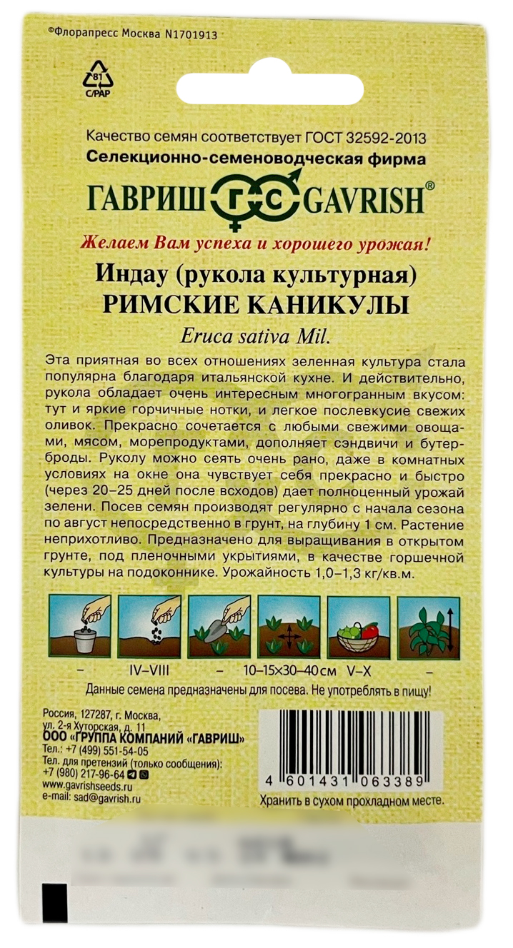 Индау РИМСКИЕ КАНИКУЛЫ ГАВРИШЭта приятная во всех отношениях зеленная культура стала популярна благодаря итальянской кухне. И действительно рукола обладает очень интересным многогранным вкусом тут и яркие горчичные нотки, и легкое послевкусие свежих оливок. Прекрасно сочетается с любыми свежими овощами, мясом, морепродуктами, дополняет сэндвичи и бутерброды. Руколу можно сажать очень рано, даже в комнатных условиях на окне она чувствует себя прекрасно и быстро (через 20-25 дней после всходов) дает полноценный урожай зелени. Посев семян производят регулярно с начала сезона по август непосредственно в грунт, на глубину 1 см. Растение неприхотливо. Предназначено для выращивания в открытом грунте, под пленочными укрытиями, в качестве горшечной культуры на подоконнике. Урожайность 1-1,3 кг/м2.