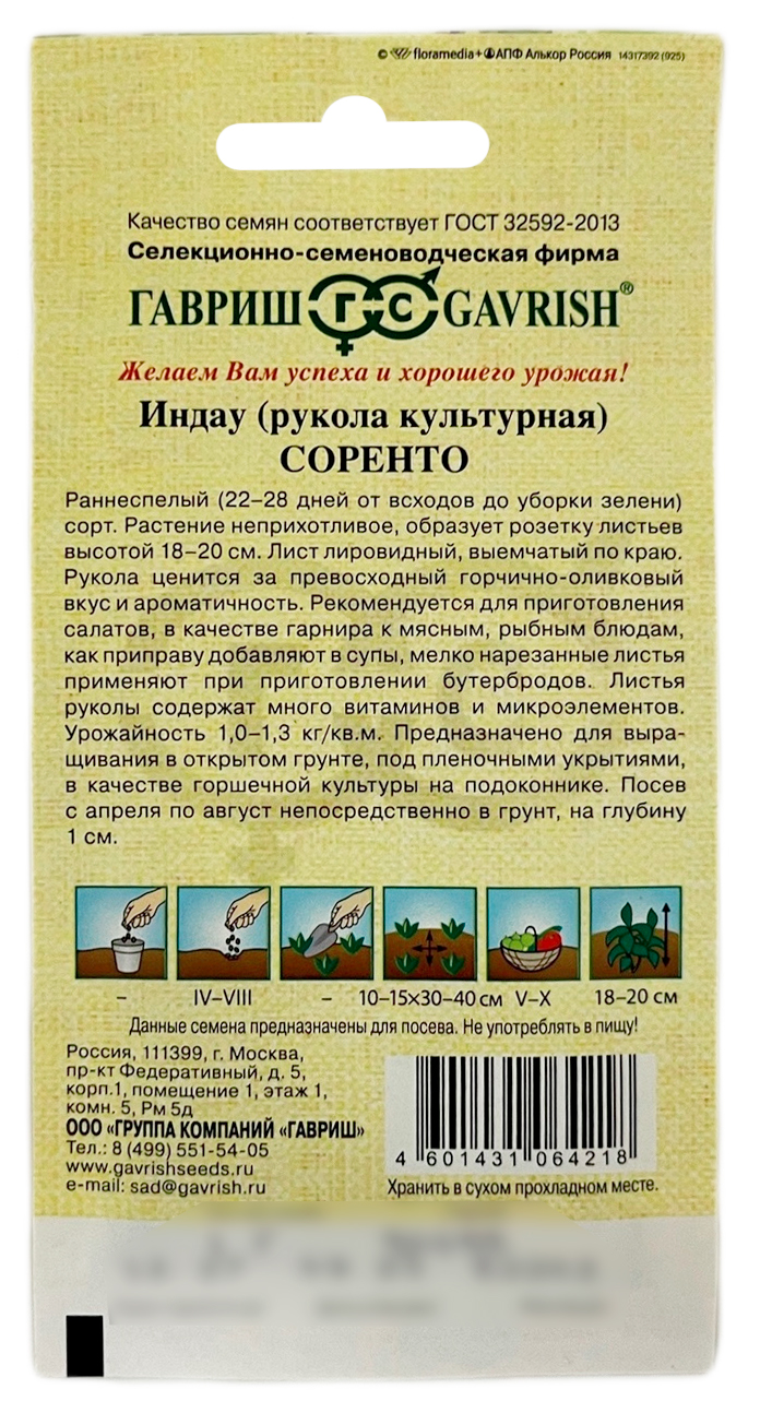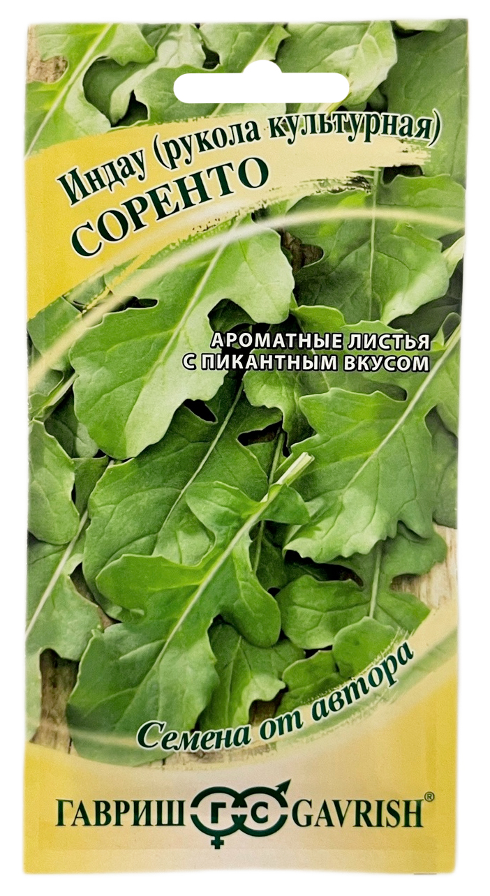 Индау СОРЕНТО ГАВРИШРаннеспелый (22-28 дней от всходов до уборки зелени) сорт. Растение неприхотливое, образует розетку листьев высотой 18-20 см. Лист лировидный, выемчатый по краю. Рукола ценится за превосходный горчично-оливковый вкус и ароматичность. Рекомендуется для приготовления салатов, в качестве гарнира к мясным, рыбным блюдам, как приправу добавляют в супы, мелко нарезанные листья применяют при приготовлении бутербродов. Листья руколы содержат много витаминов и микроэлементов. Урожайность 1,0-1,3 кг/м2.