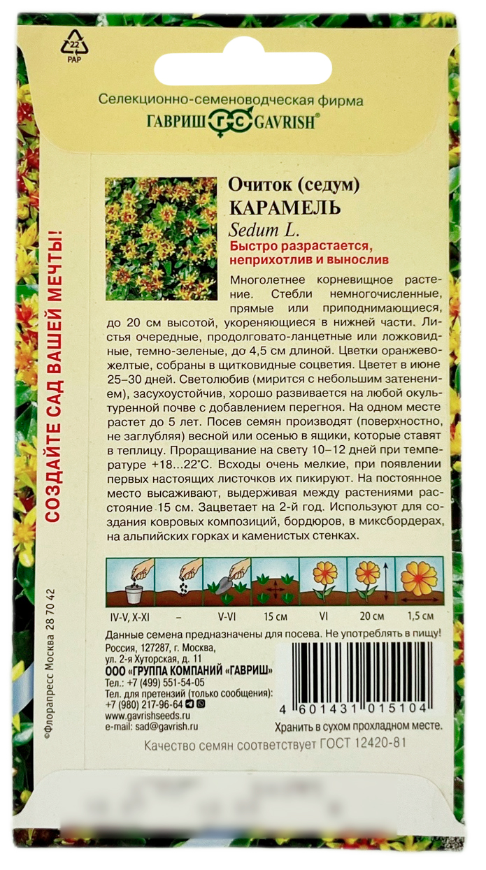 Очиток седум КАРАМЕЛЬ ГАВРИШМноголетнее корневищное растение. Стебли немногочисленные, прямые или приподнимающиеся, до 30 см высотой, укореняющиеся в нижней части. Листья расположены в очередном порядке, продолговато-ланцетные или ложковидные, тупые, в основании цельнокрайные, на верхушке тупозубчатые, темно-зеленые, до 4,5 см длиной. Цветки оранжево-желтые, собраны в щитковидные соцветия. Цветет в июне 25-30 дней.