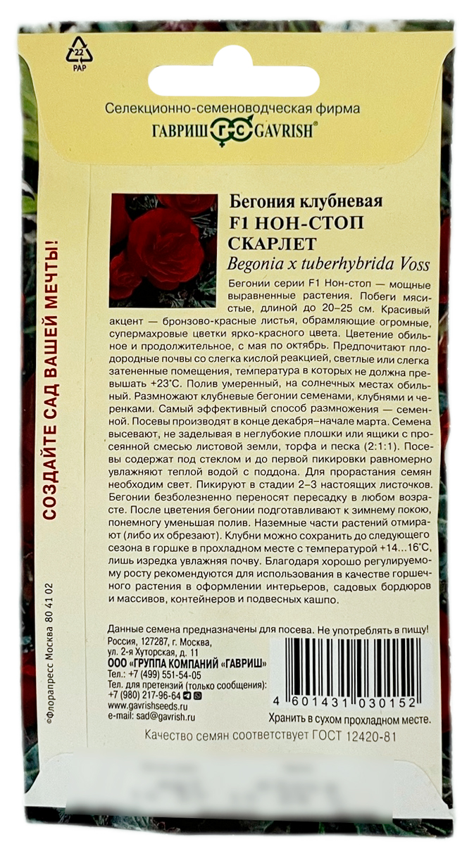Бегония клубневая НОН СТОП СКАРЛЕТ ГАВРИШ описание