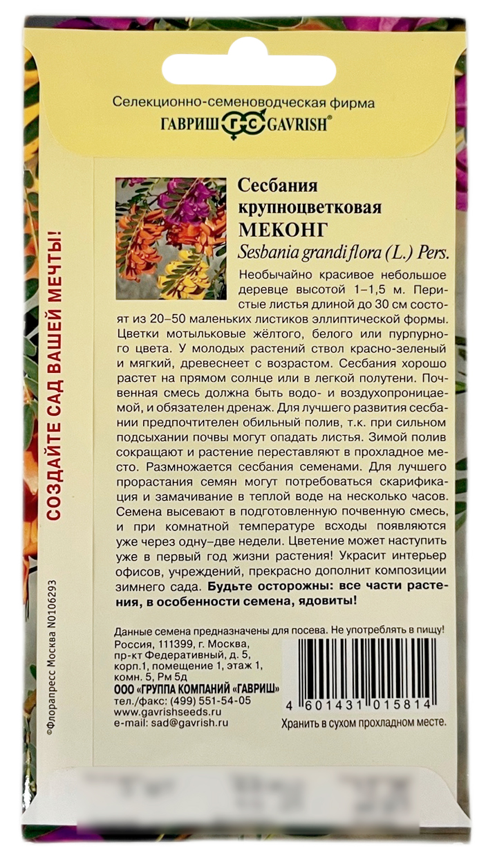 Сесбания крупноцветковая МЕКОНГ ГАВРИШНеобычайно красивое небольшое деревце высотой до 3 м. Перистые листья длиной до 30 см состоят из 20-50 маленьких листиков эллиптической формы. Цветки мотыльковые жёлтого, белого или пурпурного цвета. У молодых растений ствол красно-зеленый и мягкий, древеснеет с возрастом. Сесбания хорошо растет на прямом солнце или в легкой полутени. Почвенная смесь должна быть водо- и воздухопроницаемой, и обязателен дренаж. Для лучшего развития сесбании предпочтителен обильный полив, т.к. при сильном подсыхании почвы могут опадать листья. Зимой полив сокращают и растение переставляют в прохладное место. Размножается сесбания семенами. Для лучшего прорастания семян могут потребоваться скарификация и замачивание в теплой воде на несколько часов. Семена высевают в подготовленную почвенную смесь, и при комнатной температуре всходы появляются уже через одну-две недели. Цветение может наступить уже в первый год жизни растения! Будьте осторожны: все части растения, в особенности семена, ядовиты.