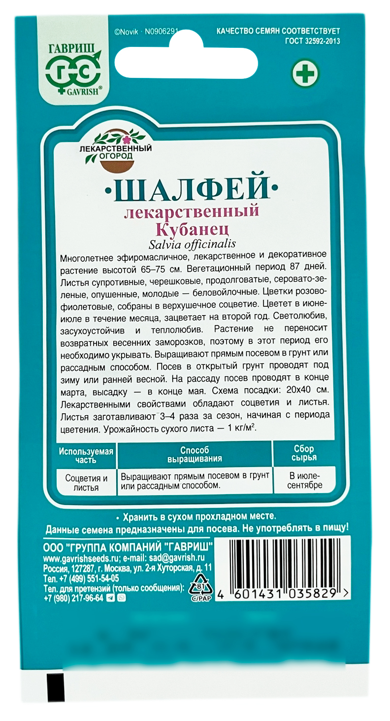 Шалфей лекарственный КУБАНЕЦ ГАВРИШМноголетнее эфиромасличное, лекарственное и декоративное растение. Вегетационный период 87 дней. Растение высотой 65-75 см. Листья супротивные, черешковые, продолговатые, верхние — сидячие, цельные, снизу серовато-зеленые, опушенные, молодые — беловойлочные. Цветки розово-фиолетовые, собраны в верхушечное соцветие. Цветет в июне-июле в течение месяца, зацветает на второй год. Светолюбив, засухоустойчив и теплолюбив. Растение не переносит возвратных весенних заморозков, поэтому его необходимо укрывать в этот период. Выращивают прямым посевом в грунт или рассадным способом. Посев проводят под зиму или ранней весной. Площадь питания растений 20х40 см. На рассаду посев проводят в конце марта, высадку — в конце мая. Лекарственными свойствами обладают соцветия и листья. Листья заготавливают 3-4 раза за сезон, начиная с периода цветения. Они обладают спазмолитическим и антисептическим свойствами, их используют для полосканий при ангинах и других заболеваниях горла. Урожайность воздушно-сухого листа — 1 кг/м2.
