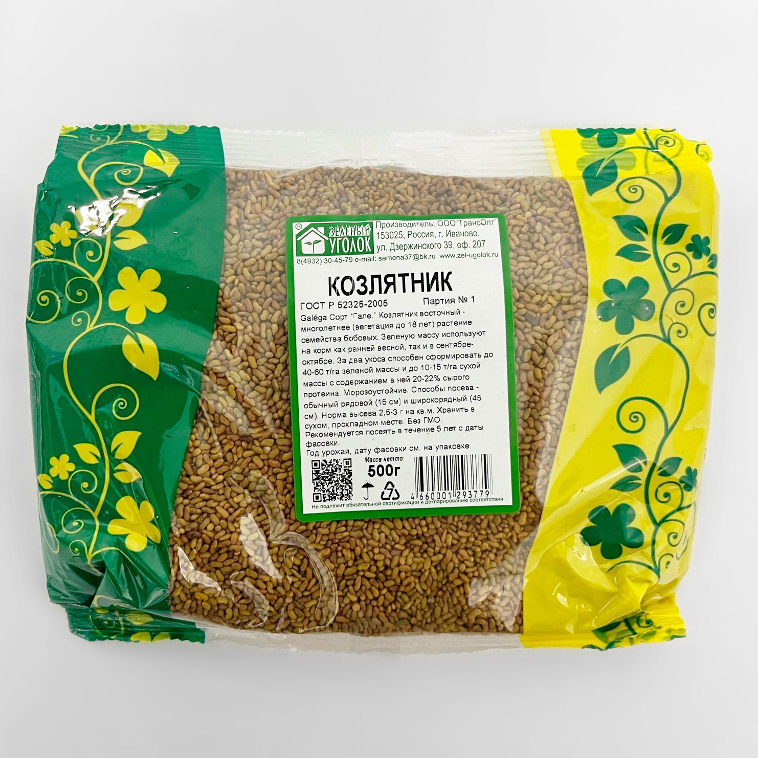 Козлятник 500гКозлятник — многолетнее корневищное травянистое растение, вид рода Козлятник семейства Бобовые. Это растение имеет толстое корневище, мощный кустистый стебель, высокий, голый или рассеянноволосистый, высотой до 1 метра. Листок непарноперистый, сложный, расположен в количестве 6-8 пар на одном стебле. Плоды — бобы заостренной формы, с семенами в количестве 3-7 штук, которые самостоятельно не растрескиваются. Период цветения – июль.