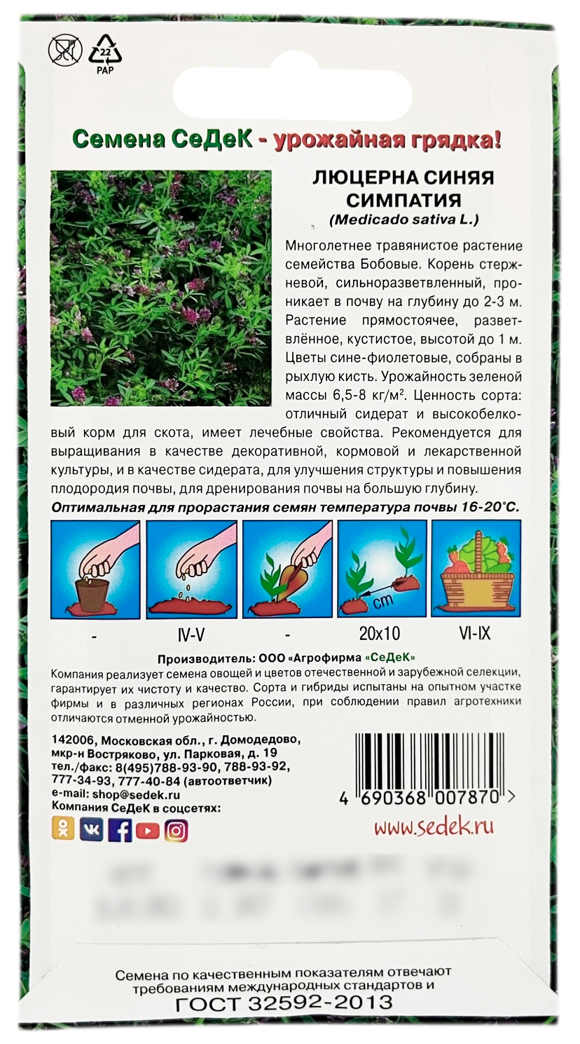 Люцерна синяя СИМПАТИЯ СеДеКМноголетнее травянистое растение семейства Бобовых. Корень стержневой, сильноразветвленный, проникает в почву на глубину до 2-3 м. Растение прямостоячее, разветвлённое, кустистое, высотой до 1 м. Цветы сине-фиолетовые, собраны в рыхлую кисть. Ценность сорта: отличный сидерат и высокобелковый корм для скота, имеет лечебные свойства. Рекомендуется для выращивания в качестве декоративной, кормовой и лекарственной культуры, и в качестве сидерата, для улучшения структуры и повышения плодородия почвы, для дренирования почвы на большую глубину.