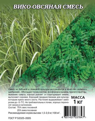 Смесь из бобовой и злаковой культуры используется в качестве «зеленого удобрения». Обогащает почву азотом, фосфором и калием, препятствует вымыванию гумуса, хорошо рыхлит и структурирует землю, вытесняет сорняки. Хороший предшественник для культур, которым нужно много азота. Растения выдерживают заморозки до 5-7°C. Не требовательны к почве, хорошо переносит засуху и затенение.Рекомендуемая норма высева 1,5-2,0 кг/100 м2.Характеристики