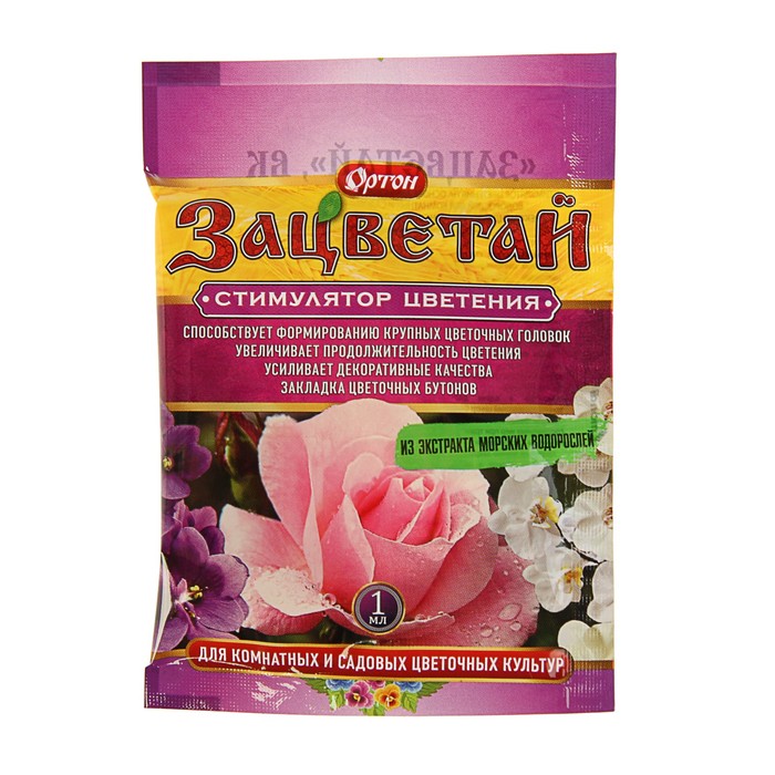 Стимулятор цветения "ЗАЦВЕТАЙ"Современный стимулятор цветения «ЗАЦВЕТАЙ» на основе аминокислот и полисахаридов морских водорослей для комнатных и садовых цветочных культур. Назначение: для стимуляции цветения садовых многолетних, однолетних, луковичных и комнатных цветочных культур. Действие: - -Способствует быстрой закладке цветочных бутонов; - - Формирует крупные цветочные головки; - - Увеличивает продолжительность жизни цветков; - - Усиливает декоративные качества и ароматность цветков; - - Повышает устойчивость к заболеваниям и стрессовым факторам внешней среды. Применение: - Содержимое ампулы (3 мл=60 капель) растворить в 3л. чистой воды (или 4-5 капель на 1 стакан воды), тщательно перемешать и провести 1-2 кратное мелкокапельное опрыскивание растений. Наиболее эффективна обработка в раннюю фазу формирования цветочных бутонов и раннюю фазу цветения. Расход раствора- 0,45- 0,7 л/10м2 или 10-25мл /растение.