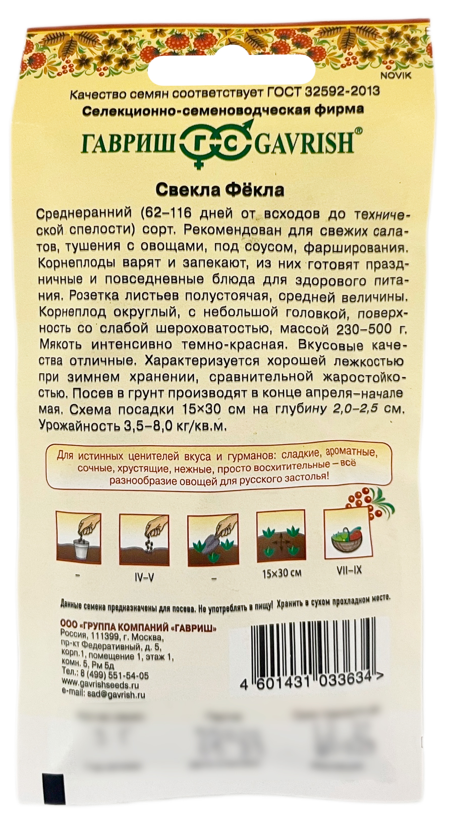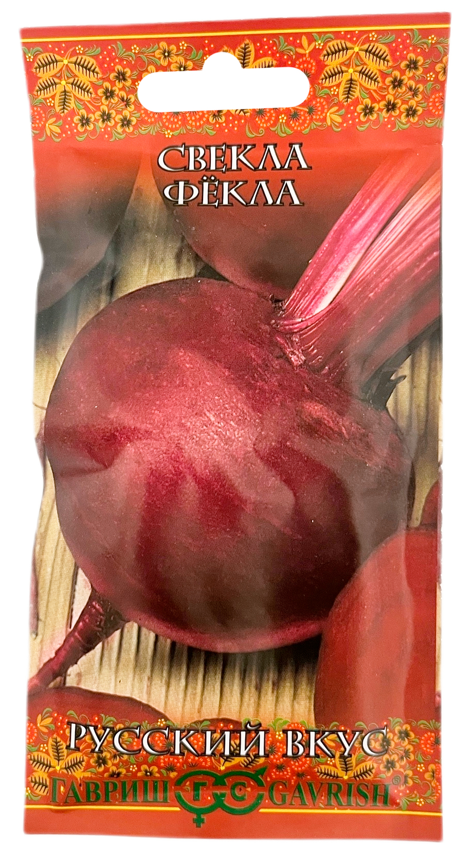 Свёкла Фекла ГАВРИШ серия Русский вкусСреднеранний (62-116 дней от всходов до технической спелости) сорт. Рекомендован для свежих салатов, тушения с овощами, под соусом, фарширования. Корнеплоды варят и запекают, из них готовят праздничные и повседневные блюда для здорового питания. Розетка листьев полустоячая, средней величины. Корнеплод округлый, с небольшой головкой, поверхность со слабой шероховатостью, массой 230-500 г. Мякоть интенсивно-темно-красная. Вкусовые качестваотличные. Характеризуется хорошей лежкостью при зимнем хранении, сравнительной жаростойкостью. Посев в грунт производят в конце апреля &ndash, начале мая. Схема посадки 15х30 см на глубину 2,0-2,5 см. Урожайность 3,5-8,0 кг/м2.