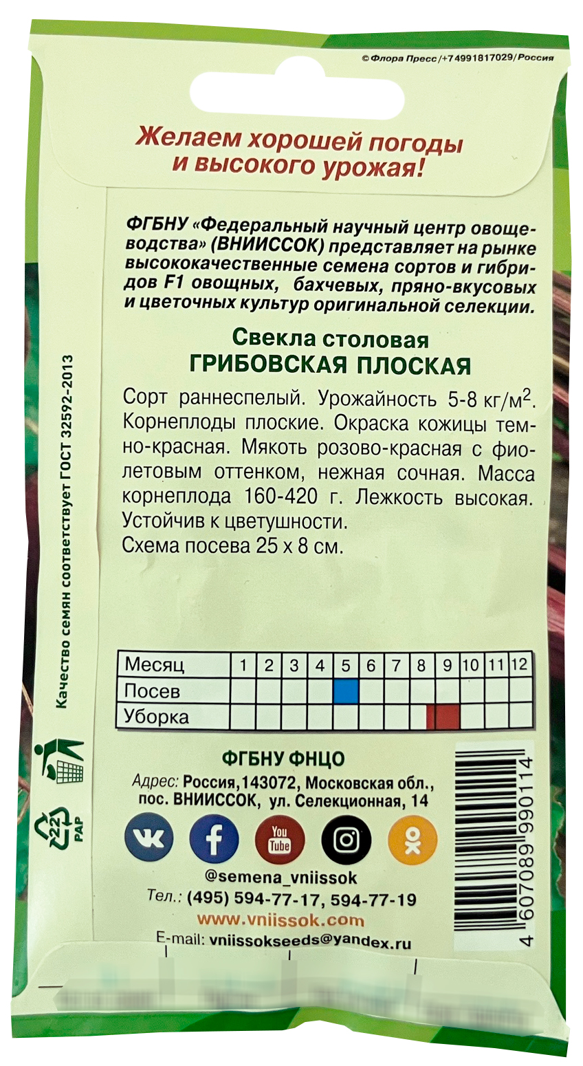 Свекла столовая Грибовская Плоская ВНИИССОКСорт раннеспелый. Корнеплоды плоские. Окраска кожицы темно-красная. Мякоть розовая-красная с фиолетовым оттенком, нежная сочная. Масса корнеплода 160-420 г. Лежскость высокая. Устойчив к цветушности.