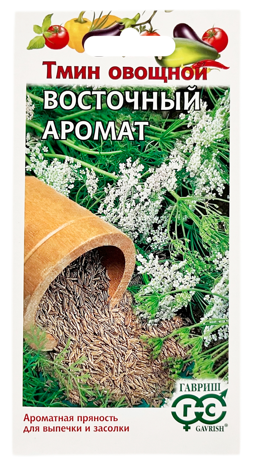 Тмин овощной ВОСТОЧНЫЙ АРОМАТ ГАВРИШДвулетнее холодостойкое пряновкусовое и лекарственное растение. Содержит минеральные соли, аскорбиновую кислоту, каротин, рутин. В первый год жизни образует розетку листьев, во второй – стебель и семена. Плод – удлиненная семянка, содержит эфирное масло. Цветет в июле. Высевают тмин густо на глубину 2-2,5 см, затем растения прореживают, оставляя расстояние между растениями 10 см. Семена прорастают медленно, всходы появляются лишь на 14-20-й день. Семена тмина осыпаются быстро, поэтому со сбором не опаздывают: убирают, когда 70-75% семян побуреет. Рекомендуется для садово-огородных участков, приусадебных и фермерских хозяйств. Корни применяют в кулинарии в качестве пряности. Листья, молодые побеги используют в салатах, семена – для ароматизации домашней выпечки, засолке огурцов, квашении капусты.