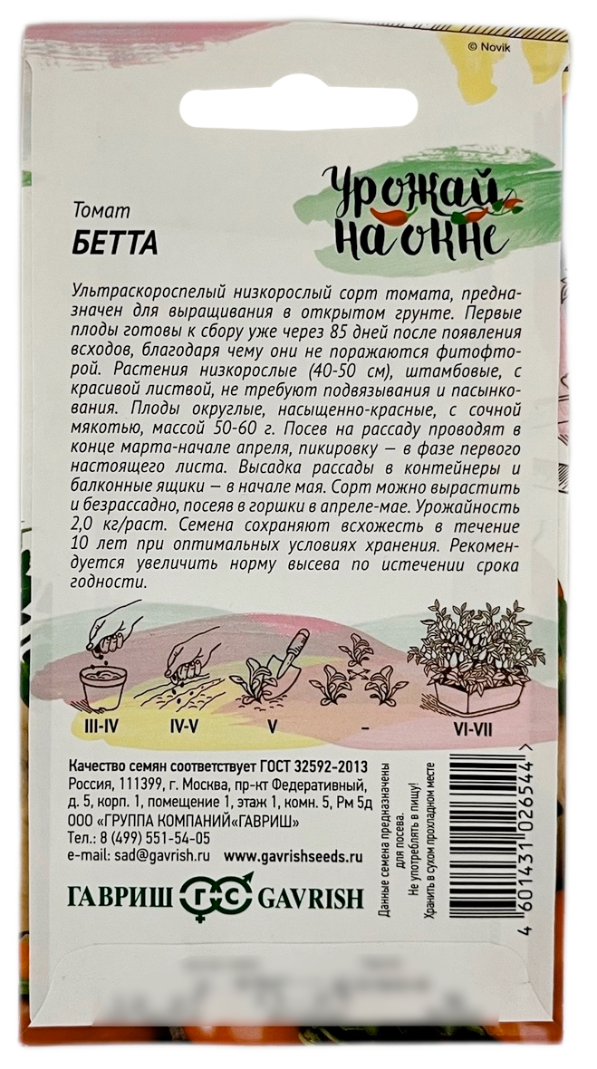 Томат БЕТТА Урожай на окне ГАВРИШУльтраскороспелый низкорослый сорт томата, предназначен для выращивания в открытом грунте. Первые плоды готовы к сбору уже через 85 дней после появления всходов, благодаря чему они не поражаются фитофторой. Растения низкорослые (40 - 50 см), штамбовые, не требующие подвязывания и пасынкования. Плоды с сочной мякотью, массой 50 - 60 г. Посев на рассаду производят в начале-середине апреля, пикировку - в фазе первого настоящего листа. Высадка рассады в грунт: в начале мая в возрасте 30-35 дней. Сорт можно выращивать прямым посевом семян в начале мая под пленочные укрытия, при этом пикируют ее в открытый грунт в начале июня. Густота посадки 4 &ndash, 5 раст./м2. Урожайность 2,0 кг/раст.
