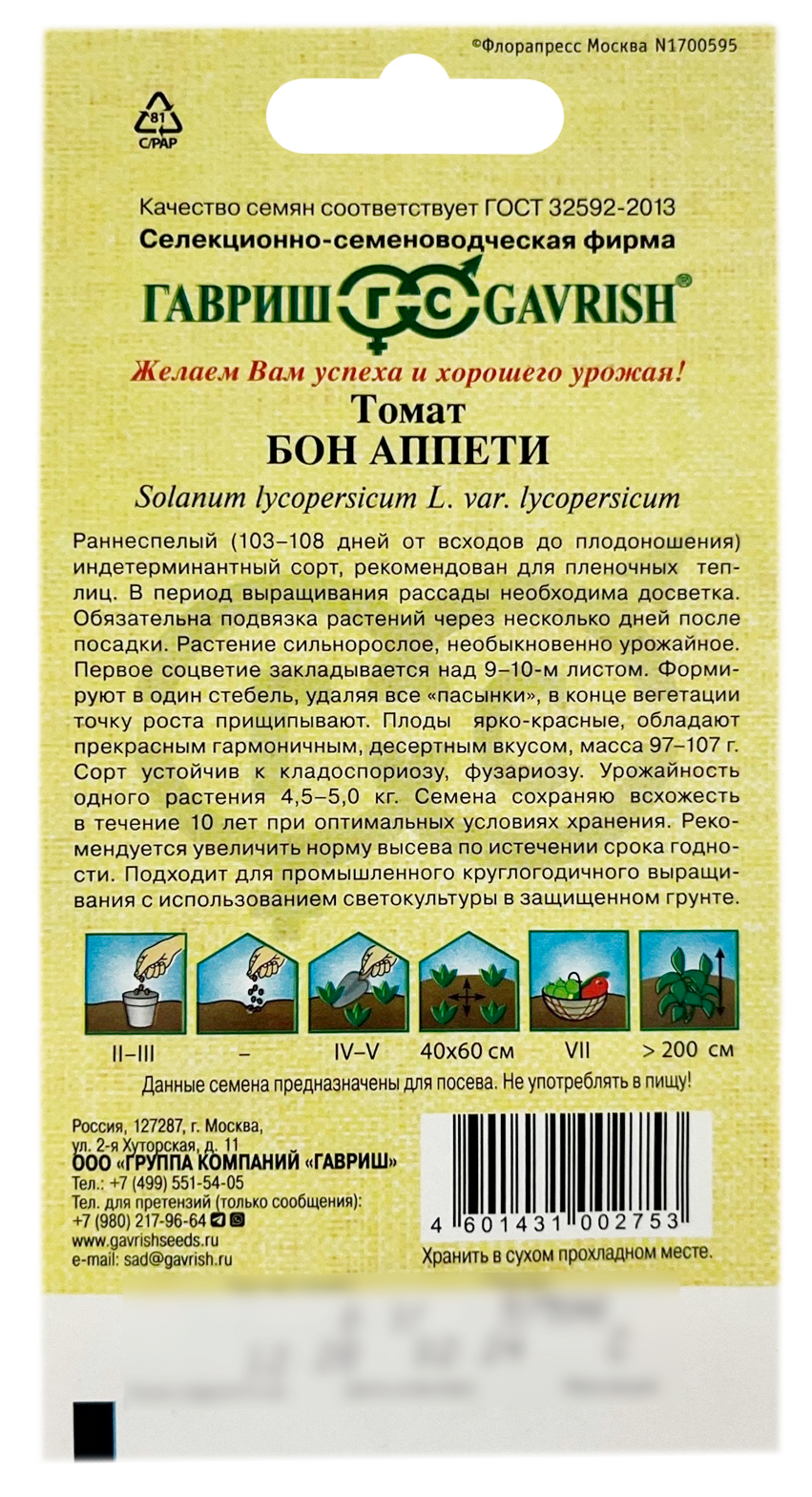 Томат БОН АППЕТИ ГАВРИШРаннеспелый (103-108 дней от всходов до плодоношения) индетерминантный сорт, рекомендован для пленочных теплиц. Относится к группе кистевых томатов. Посев на рассаду в конце февраля – начале марта. Пикировка рассады в фазе первого настоящего листа. В период выращивания рассады необходима досветка. Высадка рассады в теплицы в конце апреля в возрасте 50-55 дней. Обязательна подвязка растений через несколько дней после посадки. Растение сильнорослое, необыкновенно урожайное. Первое соцветие закладывается над 9-10-м листом. Формируют в один стебель, удаляя все «пасынки», в конце вегетации точку роста прищипывают. Плоды ярко-красные, обладают прекрасным гармоничным, десертным вкусом, масса 80-100 г. Прекрасно подходят для приготовления свежих салатов и цельноплодного консервирования. Схема посадки 40х60 см. Сорт устойчив к кладоспориозу, фузариозу. Урожайность одного растения 4,5-5,0 кг.