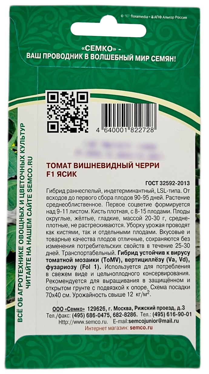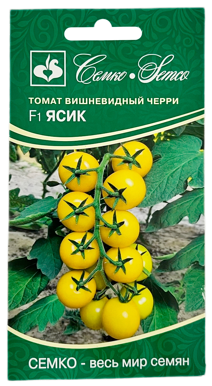 Томат вишневидный ЧЕРРИ ЯСИК СЕМКОГибрид раннеспелый, индетерминантный, LSL-типа. От всходов до первого сбора плодов 90-95 дней. Первое соцветие формируется над 9-11 листом. Кисть плотная, с 8-15 плодами. Плоды округлые, жёлтые, массой 20-30 г. Вкусовые качества отличные. Товарность и транспортабельность хорошая. Гибрид устойчив к вирусу томатной мозаики. Используется для свежего потребления и консервирования. Рекомендуется для выращивания в защищенном и открытом грунте. Схема посадки 70x40 см. Урожайность 10-12 кг/м2.