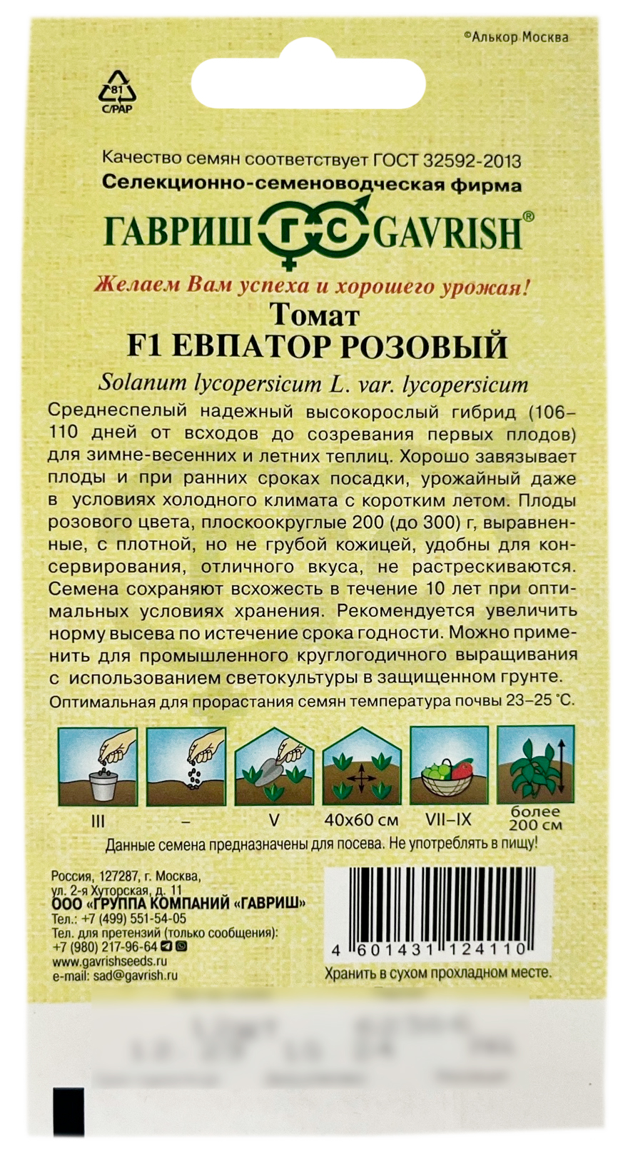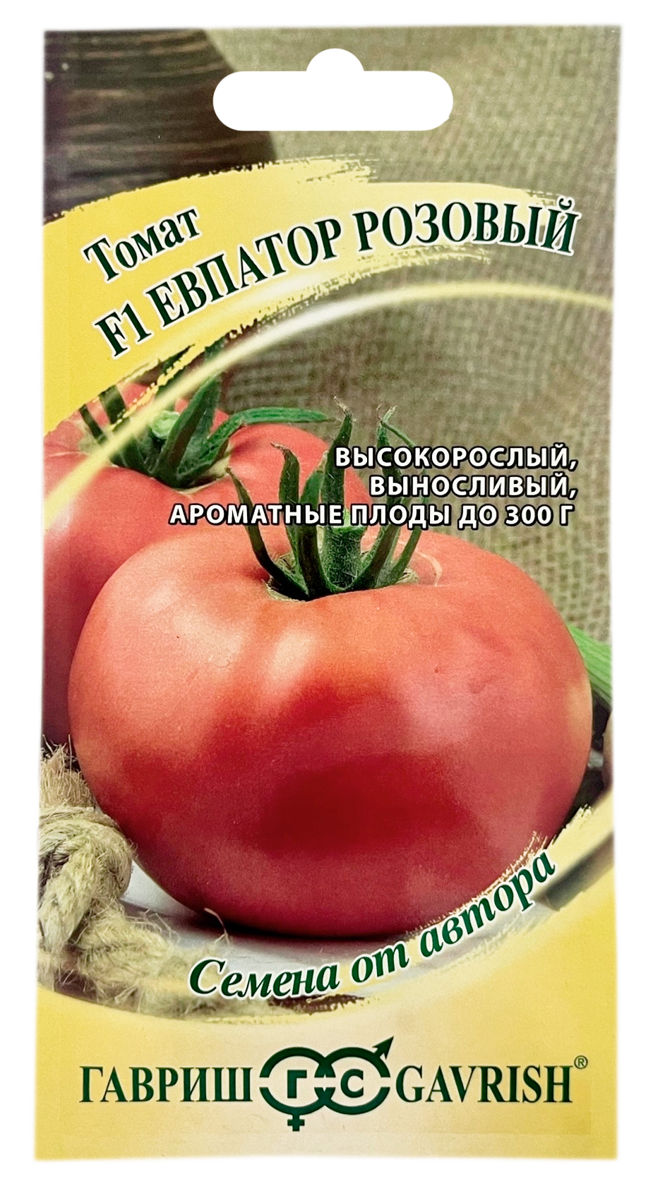 Томат F1 ЕВПАТОР РОЗОВЫЙ ГАВРИШСреднеспелый надежный высокорослый гибрид (106–110 дней от всходов до созревания первых плодов) для зимне-весенних и летних теплиц. Хорошо завязывает плоды и при ранних сроках посадки, урожайный даже в условиях холодного климата с коротким летом. Плоды розового цвета, плоскоокруглые 200 (до 300) г, выравненные, с плотной, но не грубой кожицей, удобны для консервирования, отличного вкуса, не растрескиваются. Посев на рассаду — середина–конец марта. Высадка рассады в теплицы — начало–середина мая в возрасте 45 дней. После высадки растения формируют в 1 стебель подвязывают к опоре, удаляют лишние пасынки. Семена сохраняют всхожесть в течение 10 лет при оптимальных условиях хранения. Рекомендуется увеличить норму высева по истечение срока годности. Подходит для промышленного круглогодичного выращивания с использованием светокультуры в защищенном грунте.
