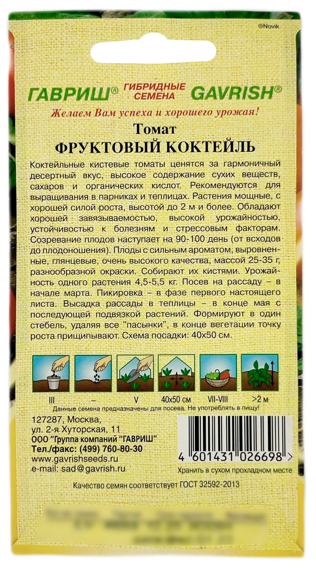 Томат ФРУКТОВЫЙ КОКТЕЙЛЬ ГАВРИШКоктейльные кистевые томаты ценятся за гармоничный десертный вкус, высокое содержание сухих веществ, сахаров и органических кислот. Рекомендуются для выращивания в парниках и теплицах. Растения мощные, с хорошей силой роста, высотой до 2 м и более. Обладают хорошей завязываемостью, высокой урожайностью, устойчивостью к болезням и стрессовым факторам. Созревание плодов наступает на 90-100 день от всходов до плодоношения. Плоды с сильным ароматом, выравненные, глянцевые, очень высокого качества, массой 25 – 35 г, разнообразной окраски. Собирают их кистями. Посев на рассаду - в начале марта. Пикировка - в фазе первого настоящего листа. Высадка рассады в теплицы - в конце мая с последующей подвязкой растений. Формируют в один стебель, удаляя все "пасынки", в конце вегетации точку роста прищипывают. Схема посадки 40х50 см. Урожайность одного растения 4,5-5,5 кг.