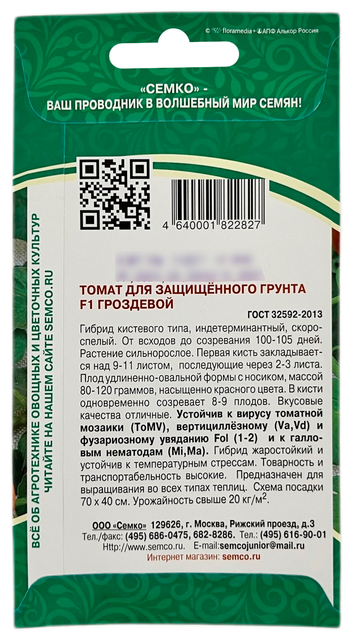 Томат ГРОЗДЕВОЙ СЕМКОРанний индетерминантный кистевой гибрид для защищенного грунта. От всходов до созревания плодов 100–105 дней. Растение сильнорослое. Первая кисть закладывается над 9–11 листом, последующие – через 3 листа. Помидор удлиненно-овальной формы с заостренной вершиной, массой 80–120 г, насыщенного красного цвета. В кисти одновременно созревает 8–9 плодов. Уборку помидоров можно проводить как кистями, так и отдельными плодами. Вкусовые качества томата отличные. Томат Гроздевой F1 жаростойкий и устойчив к температурным стрессам. Товарность и транспортабельность высокие. Гибрид устойчив к вирусу томатной мозаики (ToMV), вертициллезному увяданию (Va, Vd), фузариозному увяданию (Fol 1–2) и к галловым нематодам (Mi, Ma). Рекомендуется для потребления в свежем виде. Томат Гроздевой F1 предназначен для выращивания во всех типах теплиц. Схема посадки 70х40 см. Урожайность свыше 20 кг/м2.