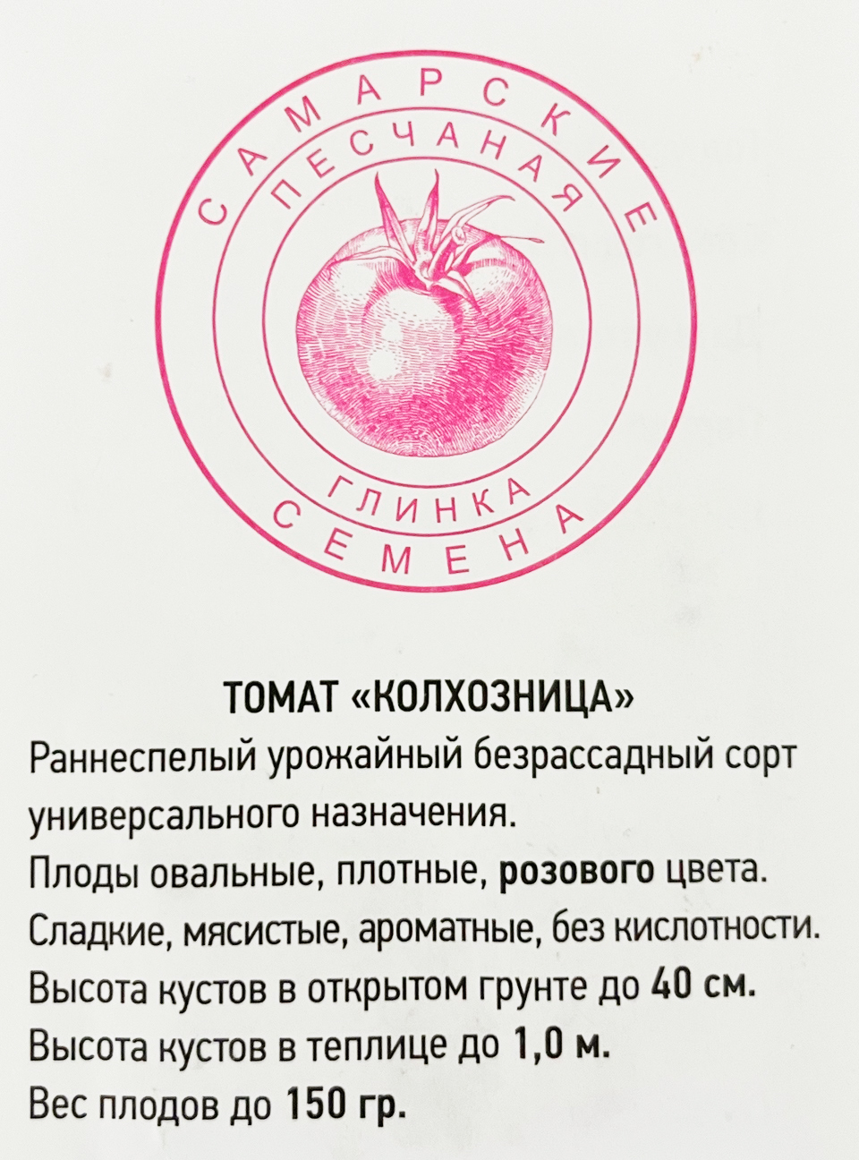 Томат КолхозницаРаннеспелый урожайный безрассадный сорт универсального назначения. Плоды овальные, плотные, розового цвета. Сладкие, мясистые, ароматные, без кислотности.