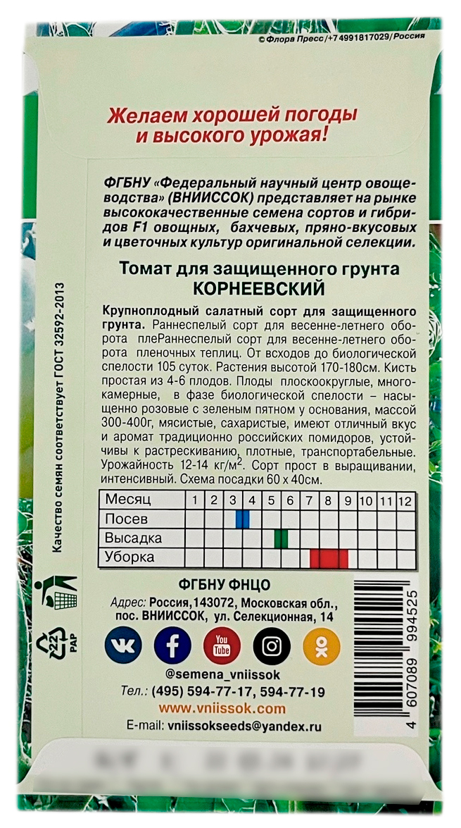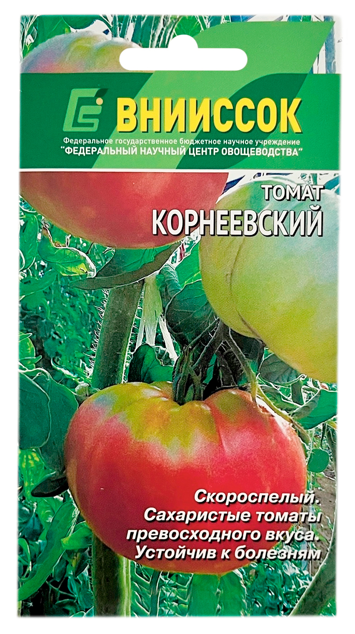Томат КОРНЕЕВСКИЙ ВНИИССОКСорт раннеспелый, от всходов до биологической спелости 105 суток. Растения индетерминантные, в пленочной теплице 170 -180см. Кисть простая, 4 - 6 плодов в кисти, многокамерные.