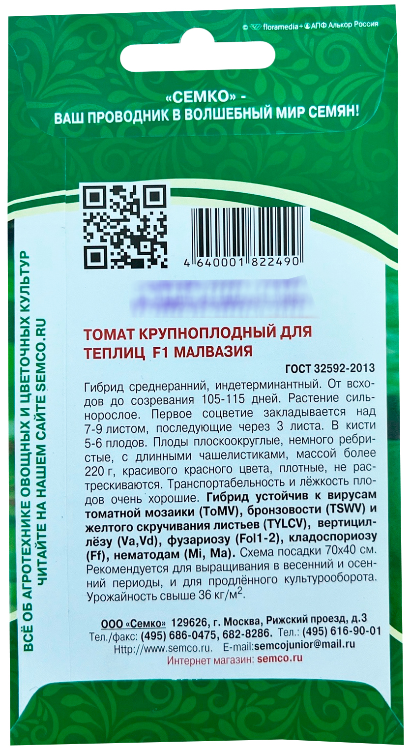Томат Малвазия F1 СЕМКОТомат Малвазия F1 - крупноплодный, среднеранний, индетерминантный биф томат для теплиц. От всходов до созревания 105–115 дней. Растение сильнорослое. Первое соцветие закладывается над 7–9 листом, последующие через 3 листа. В кисти 5–6 плодов. Помидоры плоскоокруглые, немного ребристые, с длинными чашелистиками, массой более 220 г, красивого красного цвета, плотные, не растрескиваются. Обладает хорошей завязываемостью при высоких температурах. Транспортабельность и лежкость плодов очень хорошие. Томат Малвазия F1 устойчив к вертициллезу (Va, Vd), фузариозу (Fol 1–2), кладоспориозу (Ff), вирусу томатной мозаики (TоMV). Густота посадки 2,4–2,5 растения на м2. Рекомендуется для выращивания в весенний и осенний периоды, и для продленного культурооборота. Урожайность свыше 36 кг/м2.