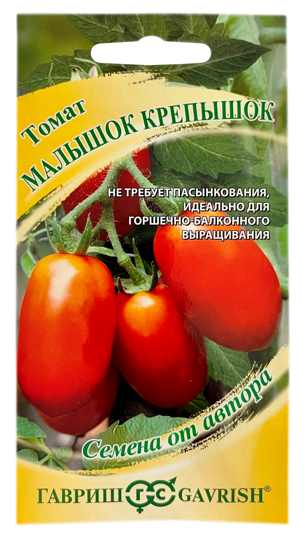 Томат МАЛЫШОК КРЕПЫШОК ГАВРИШБлагодаря невысокому росту в 30 см томат идеально подходит для выращивания на балконе и подоконнике. Это декоративное прочное растение с крупными пузырчатыми листьями, не требующее пасынкования. Через 100-110 дней после всходов на нем созревают красные пальчиковые плоды массой 20 г. Семена сохраняют всхожесть в течение 10 лет при оптимальных условиях хранения. Рекомендуется увеличить норму высева по окончании срока годности. Можно применить для промышленного круглогодичного выращивания с использованием светокультуры в защищенном грунте.