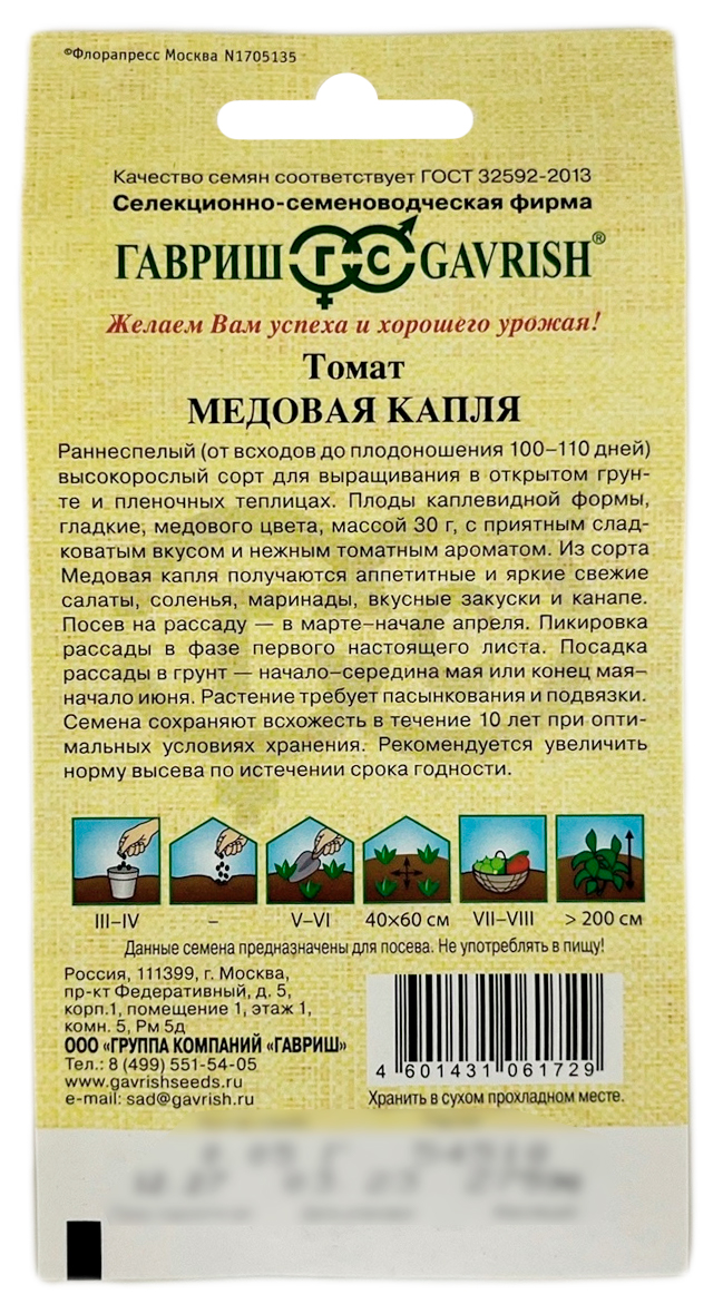 Томат МЕДОВАЯ КАПЛЯ ГАВРИШСреднеранний (от всходов до плодоношения 100-110 дней) низкорослый сорт для выращивания в открытом грунте и пленочных теплицах. Растение высотой 50-100 см. Плоды каплевидной формы, гладкие, медового цвета, массой 30 г, с приятным сладковатым вкусом и нежным томатным ароматом. Из сорта "Медовая капля" получаются аппетитные и яркие свежие салаты, соленья, маринады, вкусные закуски и канапе. Посев на рассаду — в марте-начале апреля. Пикировка рассады — в фазе первого настоящего листа. Посадка рассады в грунт — начало-середина мая или конец мая-начало июня Растение требует пасынкования и подвязки.