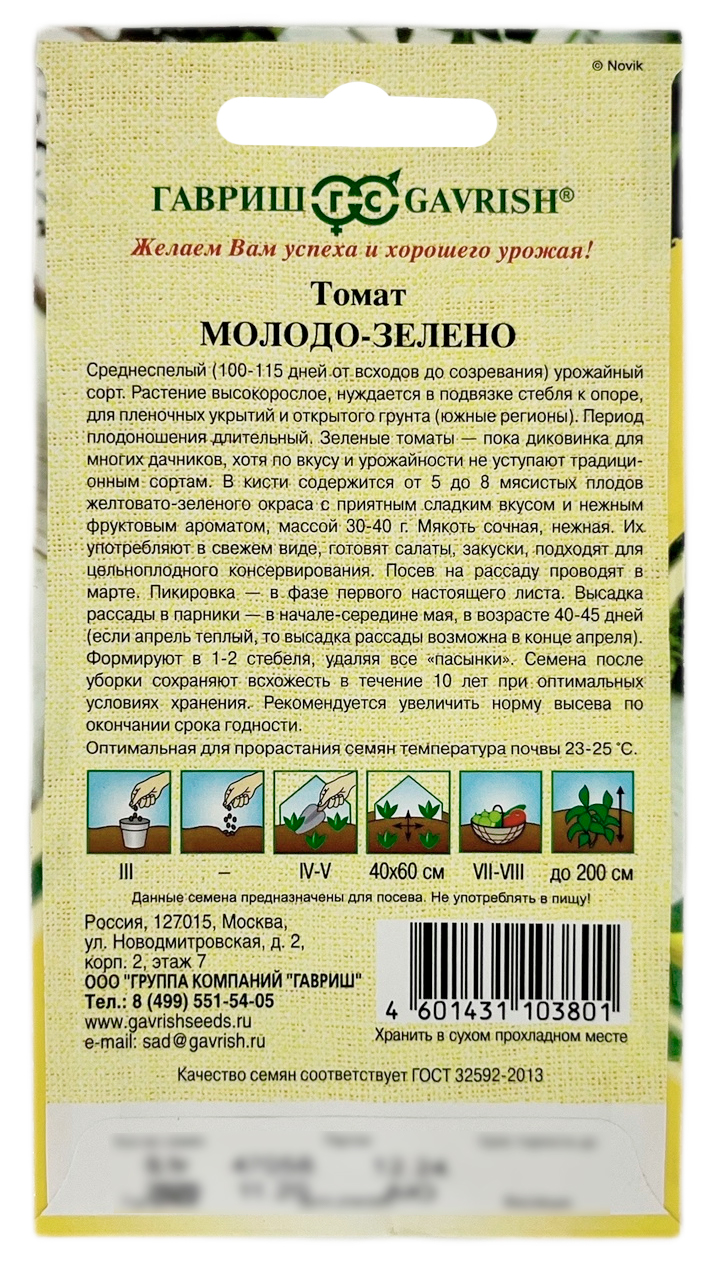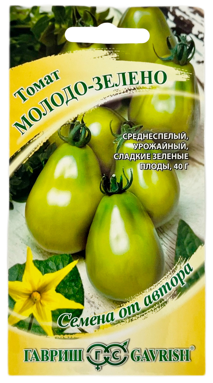 Томат Молодо-зеленоРаннеспелый (90-95 дней от всходов до созревания) урожайный сорт для теплиц и пленочных укрытий. Растение индетерминантное (высокорослое) нуждается в подвязке стебля к опоре. Зрелые плоды желто-зеленого окраса, массой 35-45 г грушевидной формы. В кисти содержится от 5 до 8 штук. Вкус приятный сладковатый с нежным фруктовым ароматом. Зеленые томаты пока диковинка для многих дачников, хотя по вкусу и урожайности не уступают традиционным сортам. Их употребляют в свежем виде, готовят салаты, закуски, соленья, маринуют и консервируют. Посев на рассаду проводят в марте. Пикировка — в фазе первого настоящего листа. Высадка рассады в теплицы — в начале-середине мая в возрасте 40-45 дней (если апрель теплый, то высадка рассады возможна в конце апреля). Формируют в один стебель, удаляя все «пасынки» и нижние листья. Период плодоношения длительный. Сорт устойчив к основным болезням томата. Семена после уборки сохраняют всхожесть в течение 10 лет при оптимальных условиях хранения. Рекомендуется увеличить норму высева по окончании срока годности.