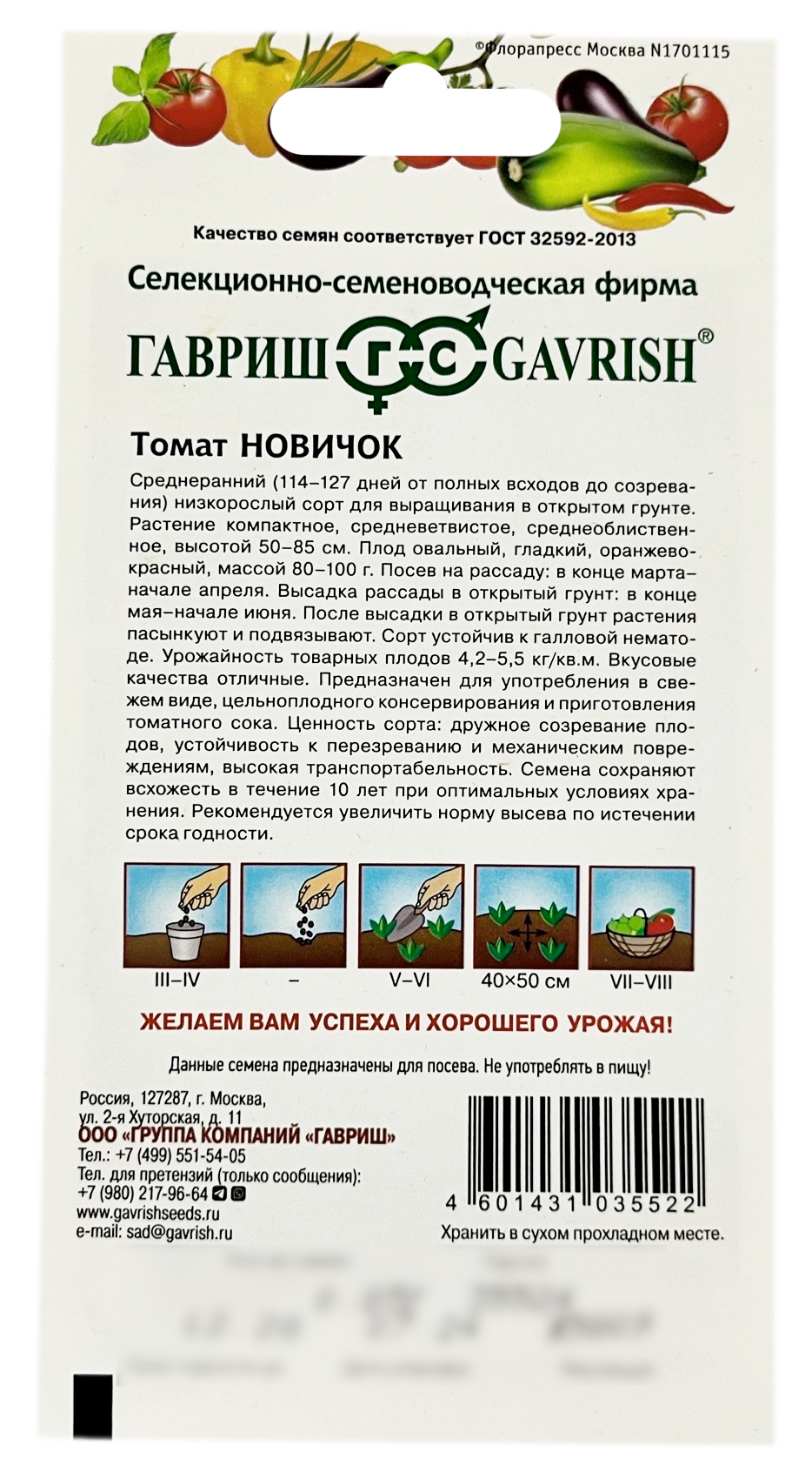 Томат НОВИЧОК ГАВРИШСреднеранний (114–127 дней от полных всходов до созревания) низкорослый сорт для выращивания в открытом грунте. Растение компактное, средневетвистое, среднеоблиственное, высотой 50–85 см. Плод овальный, гладкий, оранжево-красный, массой 80–100 г. Посев на рассаду: в конце марта – начале апреля. Высадка рассады в открытый грунт: в конце мая – начале июня. После высадки в открытый грунт растения пасынкуют и подвязывают. Сорт устойчив к галловой нематоде. Урожайность товарных плодов 4,2–5,5 кг/м2. Вкусовые качества отличные. Предназначен для употребления в свежем виде, цельноплодного консервирования и приготовления томатного сока. Ценность сорта: дружное созревание плодов, устойчивость к перезреванию и механическим повреждениям, высокая транспортабельность.