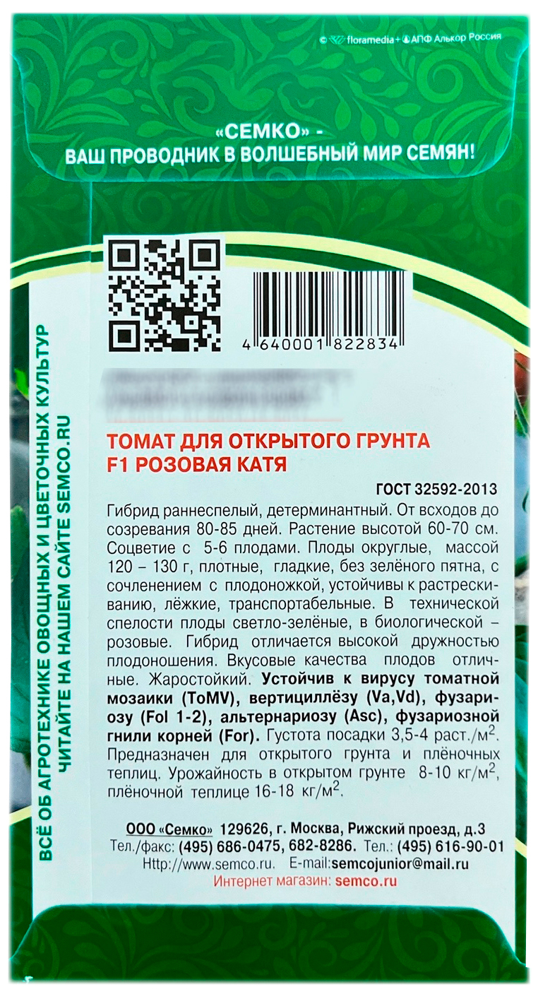 Семена томата для открытого грунта РОЗОВАЯ КАТЯ F1 СЕМКОРанний, детерминантный гибрид томата для открытого грунта. От всходов до созревания 80–85 дней. Растение высотой 60–70 см. Соцветие с 5–6 плодами. Плоды округлые, массой 120–130 г, плотные, гладкие, без зеленого пятна, со сочленением с плодоножкой, устойчивы к растрескиванию, лежкие, транспортабельные. В технической фазе спелости плоды томата Розовая Катя F1 светло-зеленые, в биологической – розовые. Этот гибрид томата отличается высокой дружностью плодоношения. Вкусовые качества плодов отличные. Жаростойкий. Устойчив к вирусу томатной мозаики (ToMV), вертициллезному увяданию (Va, Vd) и фузариозному увяданию (Fol 1–2), альтернариозу (Asc), фузариозной гнили корней (For), бактериальной пятнистости (Pst). Схема посадки 70х30 см. Гибрид томата Розовая Катя F1 предназначен для открытого грунта и пленочных теплиц.