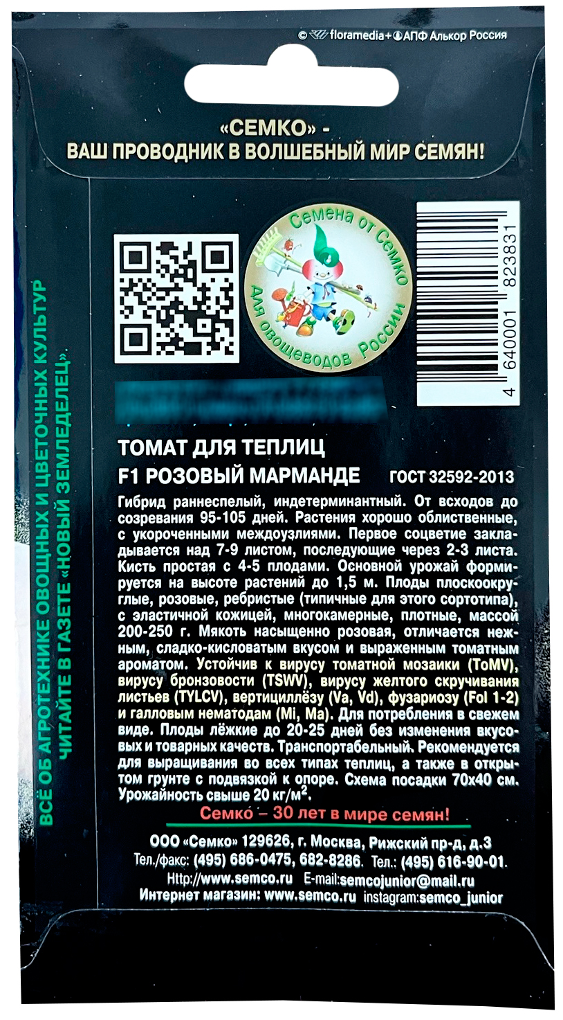 Томат Розовый Марманде СЕМКОРанний индетерминантный гибрид для выращивания в защищенном грунте, а также в открытом грунте с подвязкой к опоре. От всходов до созревания 95-105 дней. Растения хорошо облиственные, с укороченными междоузлиями. Первое соцветие закладывается над 7-9 листом, последующие через 2-3 листа. Кисть простая с 4-5 плодами. Основной урожай формируется на высоте растений до 1,5 м. Помидоры плоскоокруглые, розовые, ребристые (типичные для этого сортотипа), с эластичной кожицей, многокамерные, плотные, массой 200-250 г. Мякоть насыщенно розовая, отличается нежным, сладко-кисловатым вкусом и выраженным томатным ароматом. Томат Розовый Марманде F1 устойчив к вирусу томатной мозаики (ToMV), вирусу бронзовости (TSWV), вирусу желтого скручивания листьев (TYLCV), вертициллёзу (Va, Vd), фузариозу (Fol 1-2) и галловым нематодам (Mi, Ma). Для потребления в свежем виде. Плоды лёжкие до 20-25 дней без изменения вкусовых и товарных качеств. Транспортабельный. Рекомендуется для выращивания во всех типах теплиц, а также в открытом грунте с подвязкой к опоре. Схема посадки 70х40 см. Урожайность свыше 20 кг/м2.