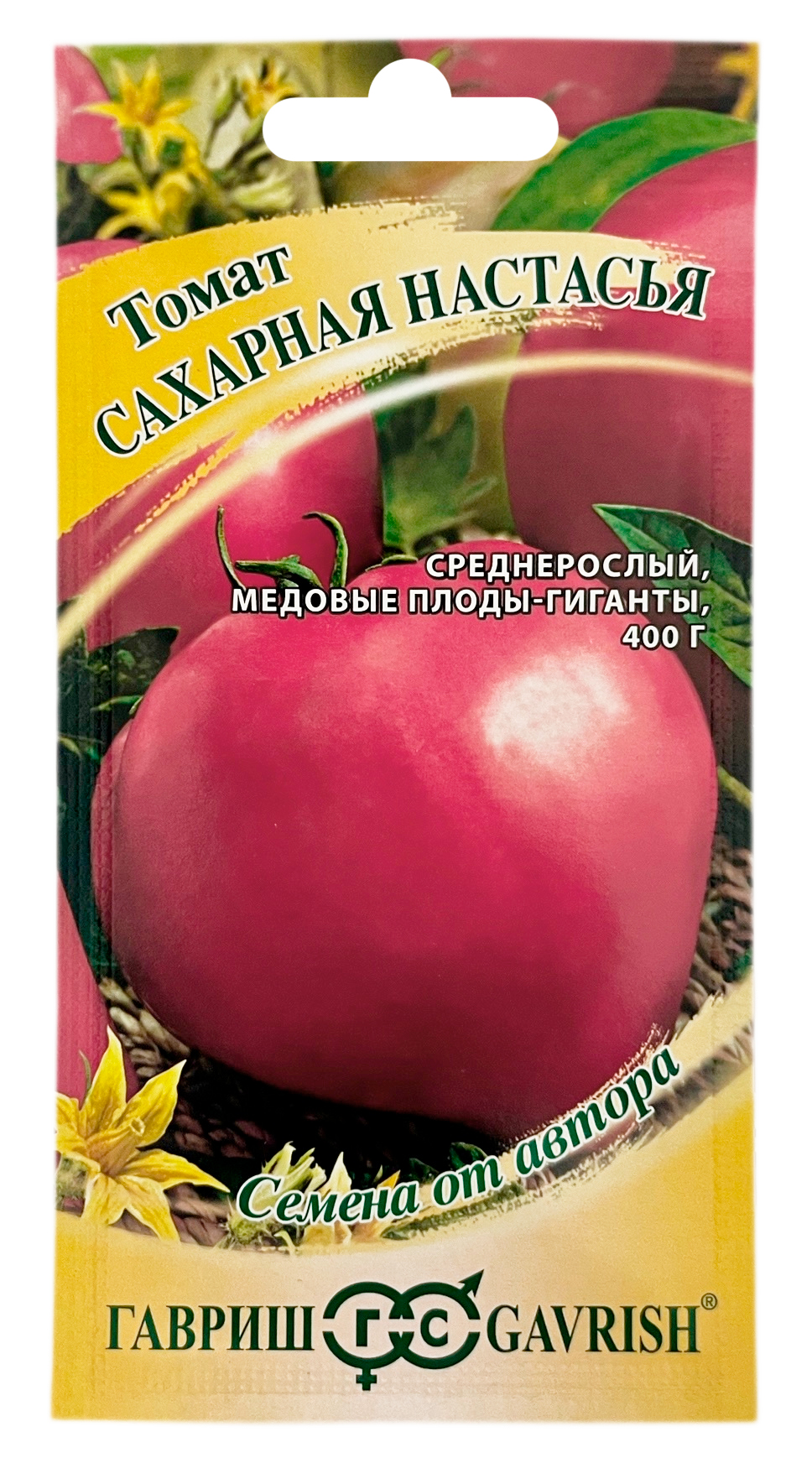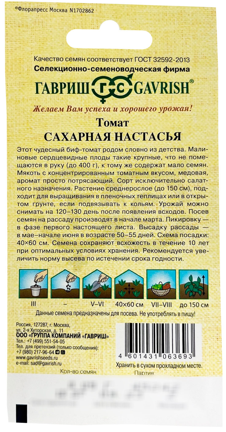 Томат Сахарная Настасья ГАВРИШЭтот чудесный биф-томат родом, словно из детства. Малиновые сердцевидные плоды такие крупные, что не помещаются в руку (до 400 г), к тому же содержат мало семян. Мякоть с концентрированным томатным вкусом, медовая, аромат просто потрясающий. Сорт исключительно салатного назначения. Растение среднерослое (до 150 см), подходит для выращивания в пленочных теплицах или в открытом грунте, если подвязывать к кольям. Урожай можно снимать на 120-130 день после появления всходов. Посев семян на рассаду производят в начале марта. Пикировку — в фазе первого настоящего листа. Высадку рассады — в мае - начале июня в возрасте 50-55 дней. Схема посадки: 40х60.
