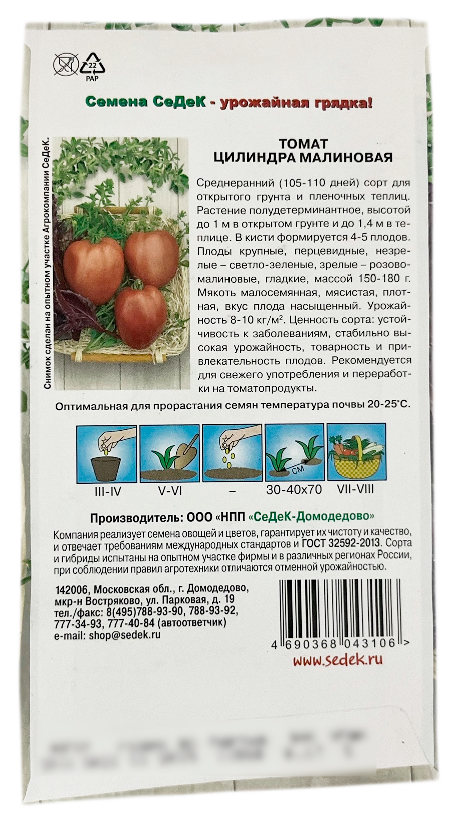 Томат Цилиндра Малиновая СеДеКСреднеранний (105-110 дней) сорт для открытого грунта и пленочных теплиц. Растение полудетерминантное, высотой до 1м в открытом грунте и до1,4 м в теплице. В кисти формируется 4-5 плодов. Плоды крупные, перцевидные, незрелые – светло-зеленые, зрелые – розово-малиновые, гладкие, массой 150-180 г. Мякоть малосемянная, мясистая, плотная, вкус плода насыщенный. Урожайность 8-10 кг/м2. Ценность сорта: устойчивость к заболеваниям, стабильно высокая урожайность, товарность и привлекательность плодов. Рекомендуется для свежего употребления и переработки на томатопродукты.