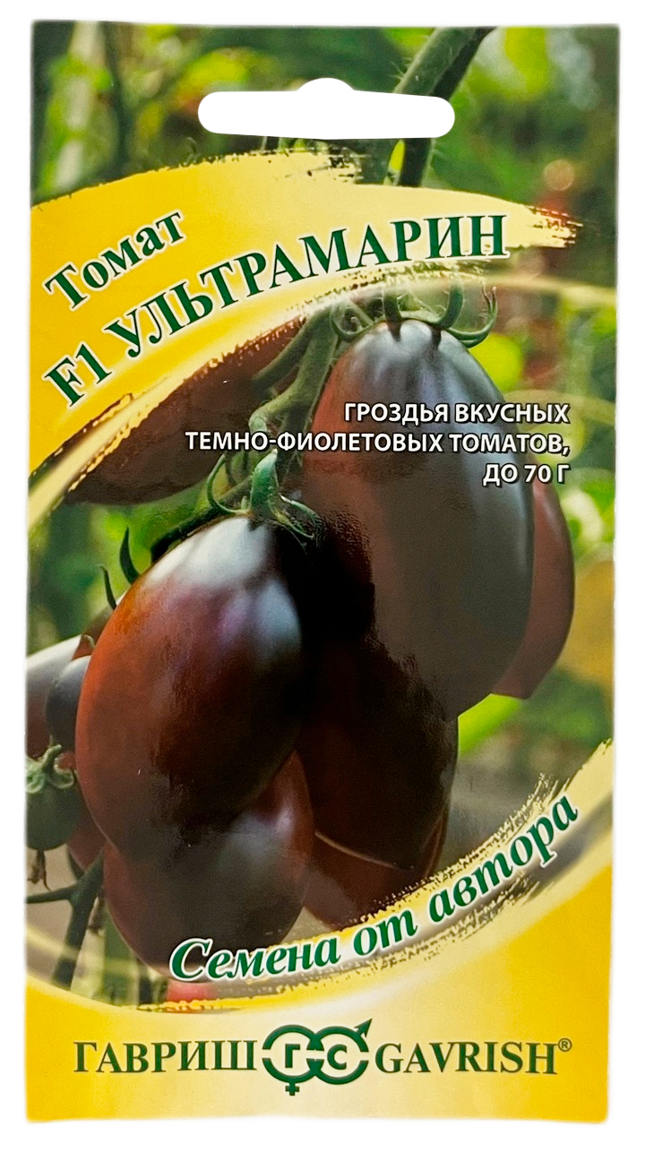 Томат УЛЬТРАМАРИН ГАВРИШУрожайный, экзотический томат удивит своими необычными темно-фиолетовыми плодами. Плоды созревают через 115-120 дней от всходов. Растение индетерминантное (высокорослое) нуждается в опоре и пасынковании. Рекомендуется для теплиц и временных пленочных укрытий. Плоды сливовидной формы, темно-фиолетового цвета, средней плотности, массой до 70 г. Кисть содержит 7-9 плодов. Отличного томатного вкуса, сочные, сладковатые, с фруктовым привкусом. Хороши для употребления в свежем виде, салатов, украшения различных блюд. Посев на рассаду проводят в конце марта-начале апреля. Пикировка в фазе первого настоящего листа. В теплицы высаживают рассаду в возрасте 30-40 дней в конце апреля-начале мая. Схема посадки: 40х60 см.