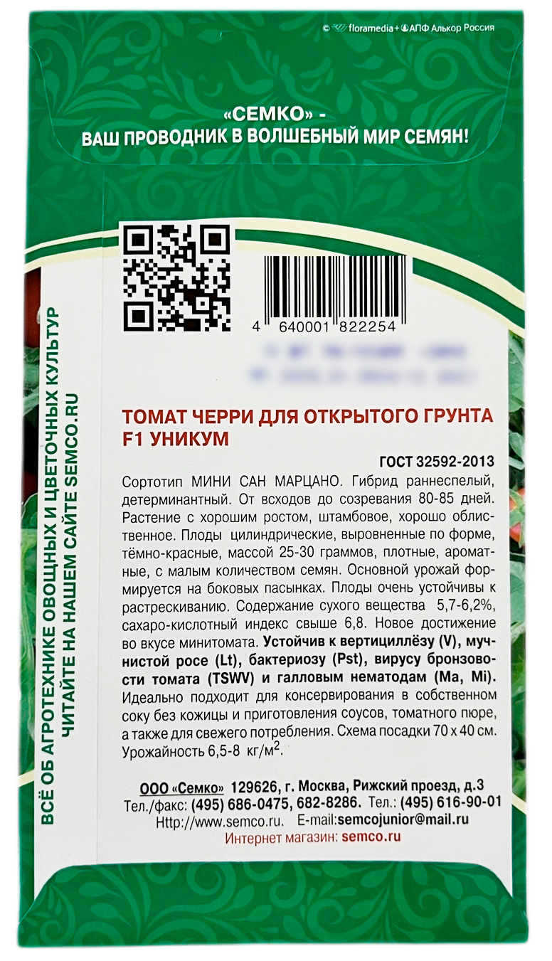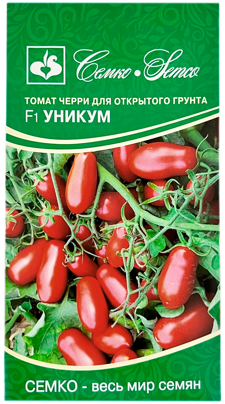 Томат Уникум F1Ранний, детерминантный гибрид томата черри для открытого грунта. От всходов до созревания 80-85 дней. Растение с хорошим ростом, штамбовое, хорошо облиственное. Томаты цилиндрические, выровненные по форме, тёмно-красные, массой 25-30 граммов. Помидоры очень устойчивы к растрескиванию. Содержание сухого вещества 5,7-6,2%, сахарокислотный индекс свыше 6,8%. Новое достижение во вкусе помидоров черри. Томат Уникум F1 устойчив к вертициллёзу (V), мучнистой росе (Lt), нематоде (N), бактериозу (Pst), вирусу бронзовости (TSWV). Используется для консервирования без кожицы и приготовления томатного пюре, а также для свежего потребления. Пригоден для машинной уборки. Урожайность 6,5-8 кг/м2.