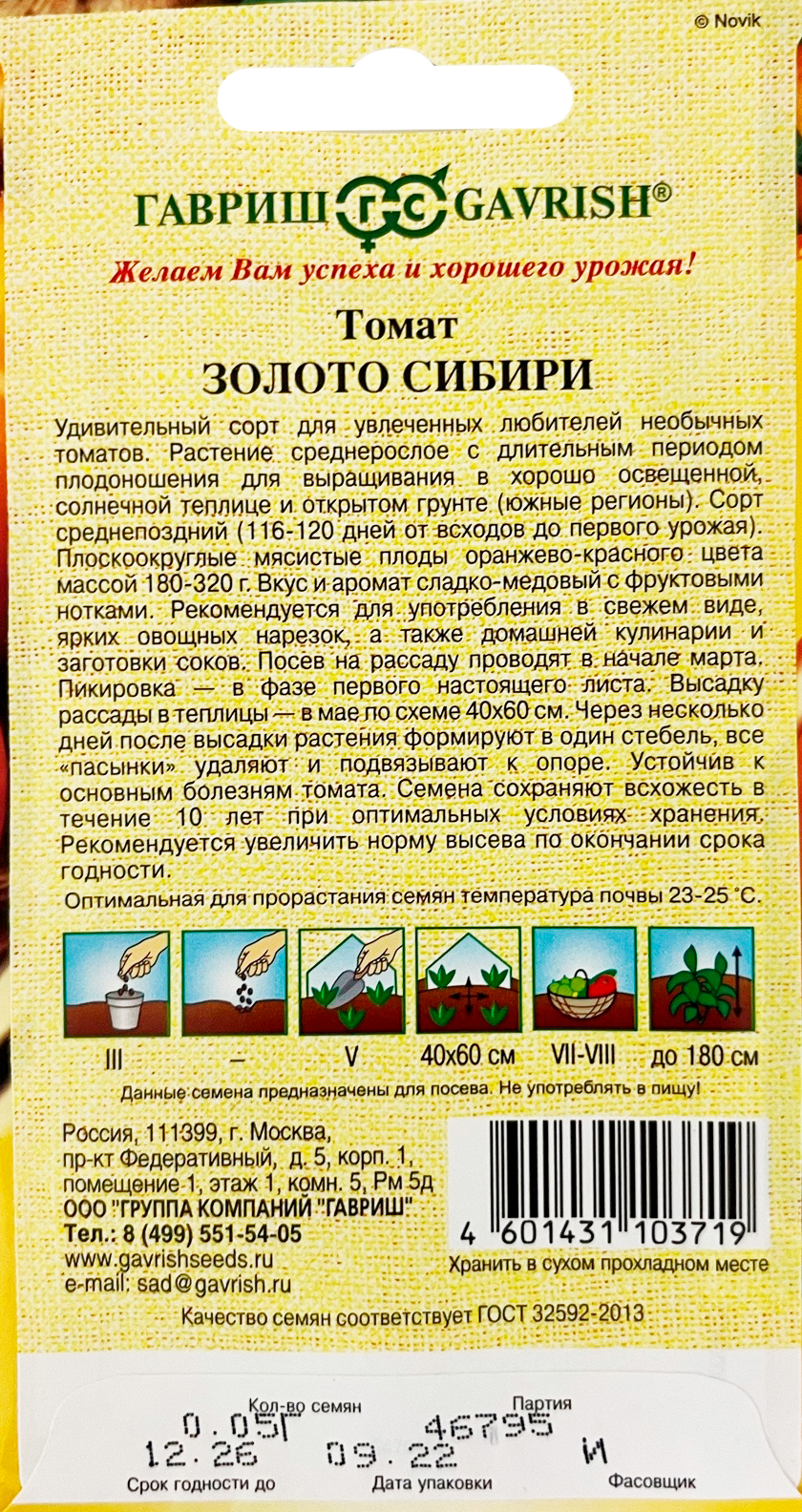 Томат Золото СибириУдивительный сорт для увлеченных любителей необычных биколорных томатов. Растение среднерослое с длительным периодом плодоношения для выращивания в хорошо освещенной, солнечной теплице. Сорт среднепоздний (116-120 дней от всходов до первого урожая). Плоскоокруглые мясистые плоды оранжево-красного цвета массой 180-320 г. Вкус и аромат сладко-медовый с фруктовыми нотками. Рекомендуется для употребления в свежем виде, ярких овощных нарезок, а также домашней кулинарии и заготовки соков. Посев на рассаду проводят в начале марта. Пикировка — в фазе первого настоящего листа. Высадку рассады в теплицы — в мае по схеме 40х60 см. Через несколько дней после высадки растения формируют в один стебель, все «пасынки» удаляют и подвязывают к опоре. Устойчив к основным болезням томата. Семена после уборки сохраняют всхожесть в течение 10 лет при оптимальных условиях хранения. Рекомендуется увеличить норму высева по окончании срока годности.