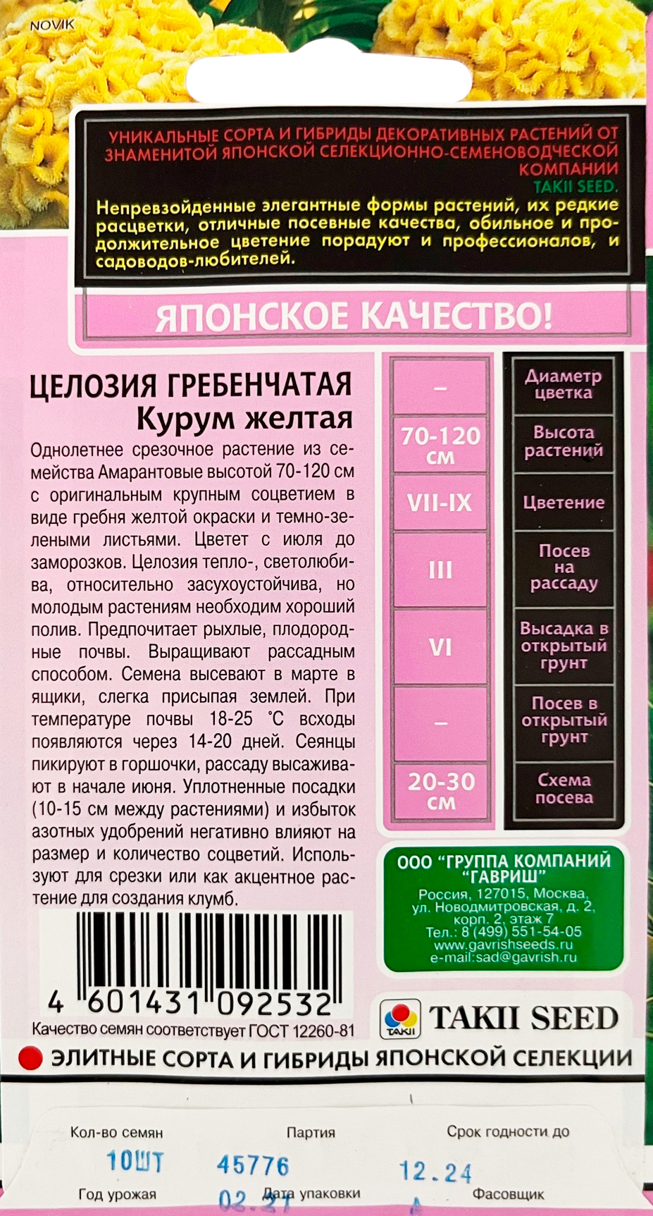 Целозия Курум желтая гребенчатая* 8 шт.Однолетнее срезочное растение из семейства Амарантовые высотой 70-120 см с оригинальным крупным соцветием в виде гребня жёлтой окраски и темно-зелеными листьями. Цветет с июля до заморозков. Целозия теплолюбива, светолюбива, относительно засухоустойчива, но молодым растениям необходим хороший полив. Предпочитает рыхлые, плодородные почвы. Выращивают рассадным способом. Семена высевают в марте в ящики, слегка присыпая землей. При температуре почвы 18-25°C всходы появляются через 14-20 дней. Сеянцы пикируют в горшочки, рассаду высаживают в начале июня. Уплотненные посадки (10-15 см между растениями) и избыток азотных удобрений негативно влияют на размер и количество соцветий. Используют для срезки или как акцентное растение для создания клумб.