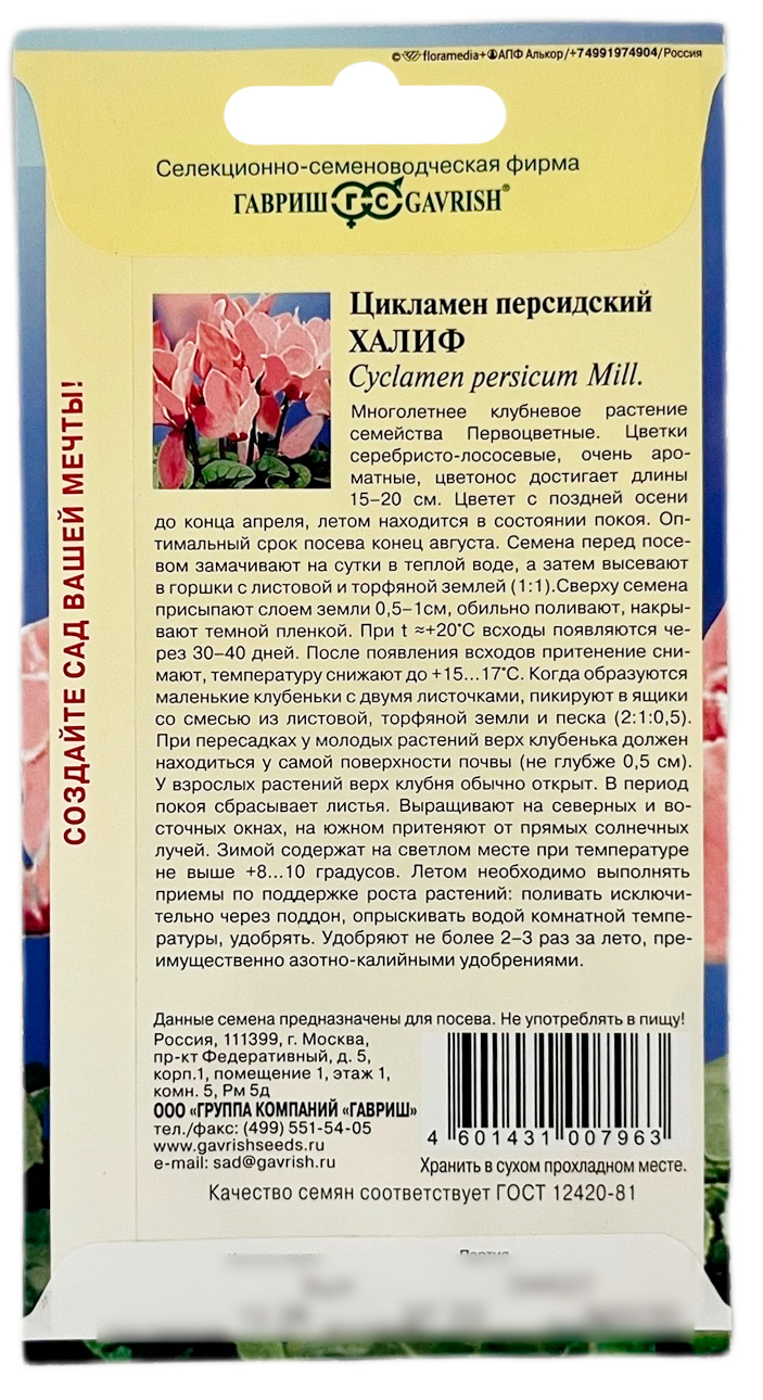 Цикламен персидский ХАЛИФ ГАВРИШМноголетнее клубневое растение семейства Первоцветные. Цветки серебристо-лососевые, очень ароматные, цветонос достигает длины 15 -20 см. Цветет с поздней осени до конца апреля, летом находится в состоянии покоя. Оптимальный срок посева конец августа. Семена перед посевом замачивают на сутки в теплой воде, а затем высевают в горшки с листовой и торфяной землей(1:1). Сверху семена присыпают слоем земли 0,5-1 см., обильно поливают, накрывают темной пленкой. При t 20 °C всходы появляются через 30-40 дней. После появления всходов притенение снимают, температуру снижают до 15-17 °C. Когда образуются маленькие клубеньки с двумя листочками, пикируют в ящики со смесью из листовой, торфяной земли и песка (2:1:0,5). При пересадках у молодых растений верх клубенька должен находиться у самой поверхности почвы (не глубже 0,5 см.). У взрослых растений верх клубня обычно открыт. В период покоя сбрасывает листья.