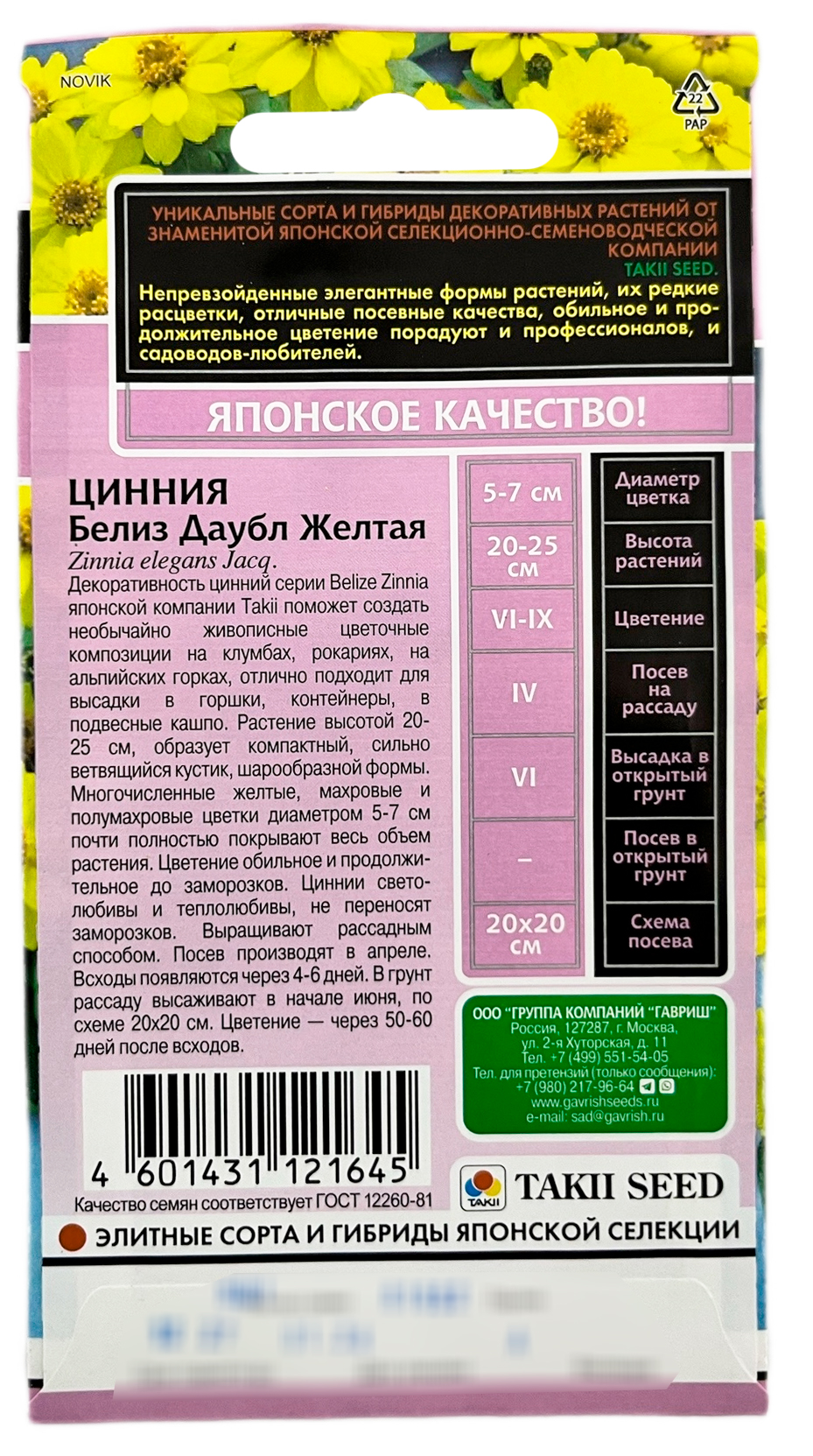 Цинния Белиз даубл желтая (Zinnia elegans Jacq) серия Эксклюзив Н24 (Zinnia elegans Jacq.)Декоративность цинний серии Belize Zinnia японской компании Takii поможет создать необычайно живописные цветочные композиции на клумбах, рокариях, на альпийских горках, отлично подходит высадки в горшки, контейнеры, в подвесные кашпо. Растение высотой 20-25 см, образует компактный, сильно ветвящийся кустик, шарообразной формы. Многочисленные желтые, махровые и полумахровые цветки диаметром 5-7 см почти полностью покрывают весь объем растения. Цветение обильное и продолжительное до заморозков. Циннии светолюбивы и теплолюбивы не переносят заморозков. Выращивают рассадным способом. Посев производят в апреле. Всходы появляются через 4-6 дней. В грунт рассаду высаживают в начале июня, по схеме 20х20 см. Цветение — через 50-60 дней после всходов.