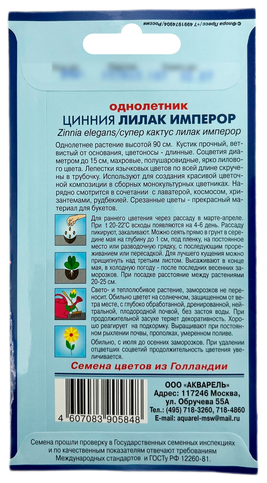 Цинния Лилак Имперор АКВАРЕЛЬОднолетнее растение высотой 90 см. Кустик прочный, ветвистый от основания, цветоносы - длинные. Соцветия диаметром до 15 см, махровые, полушаровидные, ярко лилового цвета. Лепестки язычковых цветов по всей длине скручены в трубочку. Используют для создания красивой цветочной композиции в сборных монокультурных цветниках. Нарядно смотрится в сочетании с лаватерой, космосом, хризантемами, рудбекией. Срезанные цветы - прекрасный материал для букетов.